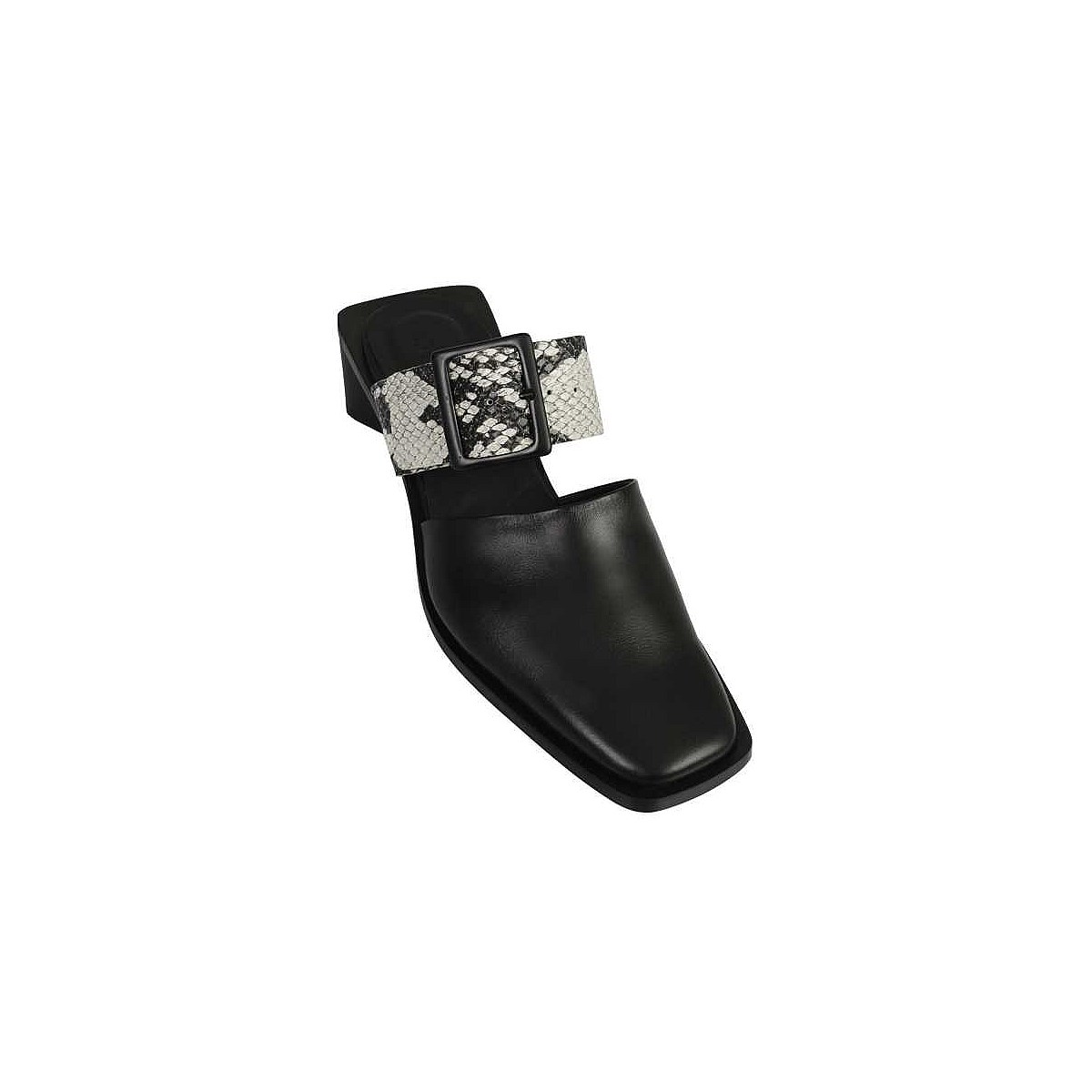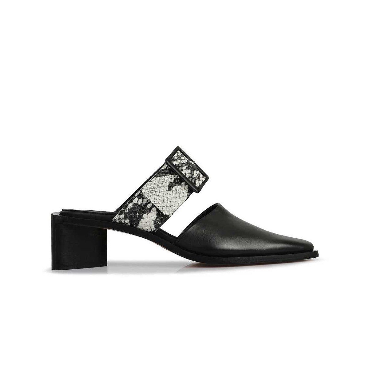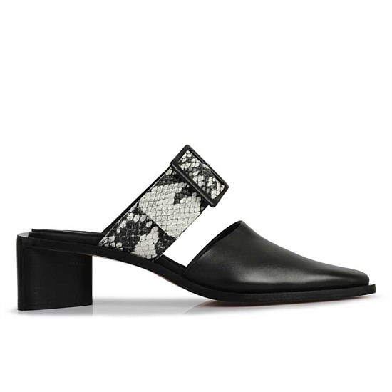 Crafted in Italy from smooth grain leather, the Pamela mules by Beau Coops feature a closed toe upper, offset by a contrast snake-print strap over the foot. Make an impact this spring with a striking geometric, stacked-leather heel and tonal buckle detailing.