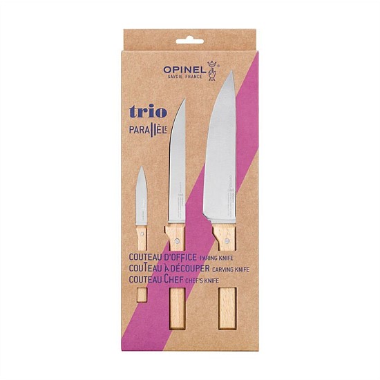 The stylish Parallele knives by Opinel have rustic beech wood handles and high quality stainless steel blades to make daily kitchen tasks simple. The perfect set for at-home chefs includes an 8cm paring knife, ideal for peeling and cutting, a 16cm carving knife which is ideal for carving meats but also for fruits and vegetables, and a 20cm chef's knife with a curved blade to allow see-saw chopping movements. A beautiful set for established and aspiring chefs.