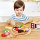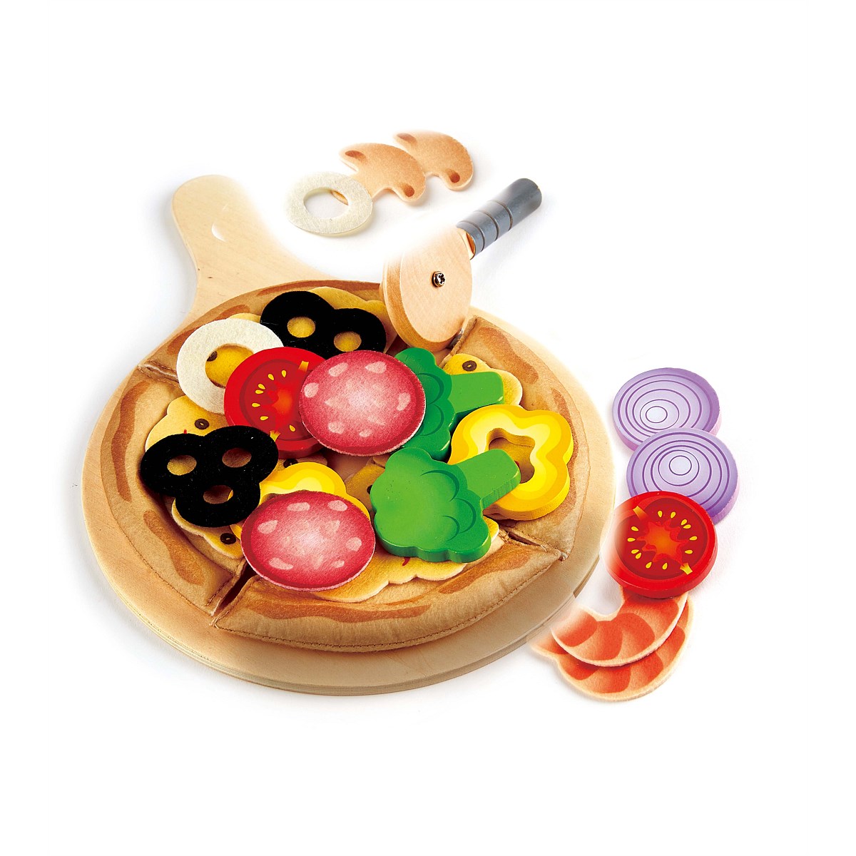 Includes one pizza base which can be cut into slices, one pizza slicer, one cutter, lots of pieces of seafood, vegetables and other pizza toppings and even a pizza oven which doubles as a delivery box