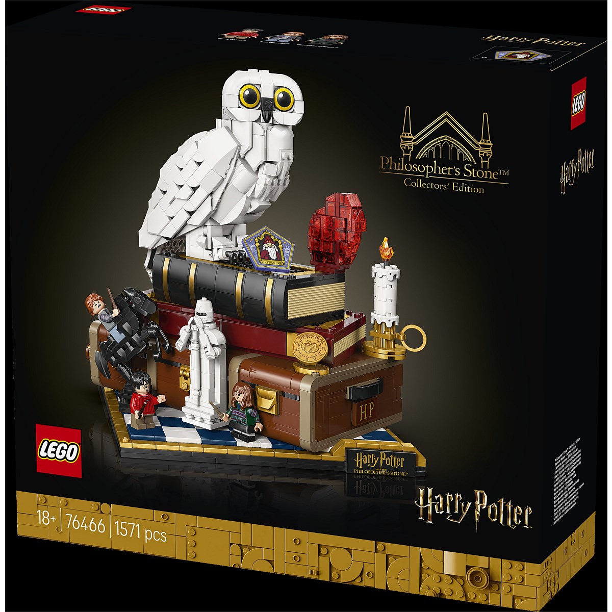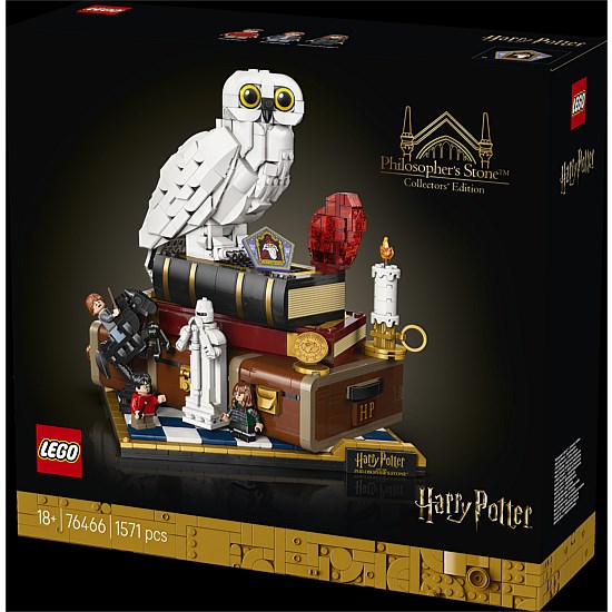 | Build nostalgia for Harry Potter and the Sorcerer's Stone with the LEGO® Harry Potter 25th anniversary Sorcerer's Stone - Collectors' Edition (76466). A top creative gift for adult Harry Potter fans, this collectible building set has fun functions, iconic characters and objects, plus microscale versions of classic scenes to inspire magical memories. Create the first LEGO Hedwig snowy owl figure with closed wings and display her next to the Sorcerer's Stone on top of Harry Potter's trunk. Add 3 LEGO Harry Potter minifigures - Harry Potter, Hermione Granger and Ron Weasley - and items including a Chocolate Frog card and a Wizard Chessboard. Turn the 3 dials to turn Hedwig's head, move the Queen on the Wizard Chessboard and blow the side off Harry Potter's trunk to reveal the mountain troll's bathroom attack scene. The other microscale scenes depict the Hogwarts Express and the 5 trials Harry faces to reach the Sorcerer's Stone. Set contains 1,571 pieces. Age 18+ years Collectible LEGO® Harry Potter and the Sorcerer's Stone 25th anniversary set A Hedwig snowy owl figure plus 3 LEGO® Harry Potter minifigures Turn the 3 dials on Harry Potter's trunk to activate fun functions Build iconic items and microscale Harry Potter and the Sorcerer's Stone scenes Creative Harry Potter gift for adult fans and collectors Discover enhanced 3D building instructions in the LEGO® Builder app Part of a collection of LEGO® Sets for Adults who enjoy creative activities This 1,571-piece LEGO® Harry Potter set measures over 9.5 in. (24 cm) high WARNING: CHOKING HAZARD - Small parts may be generated. Not for children under 3 years |