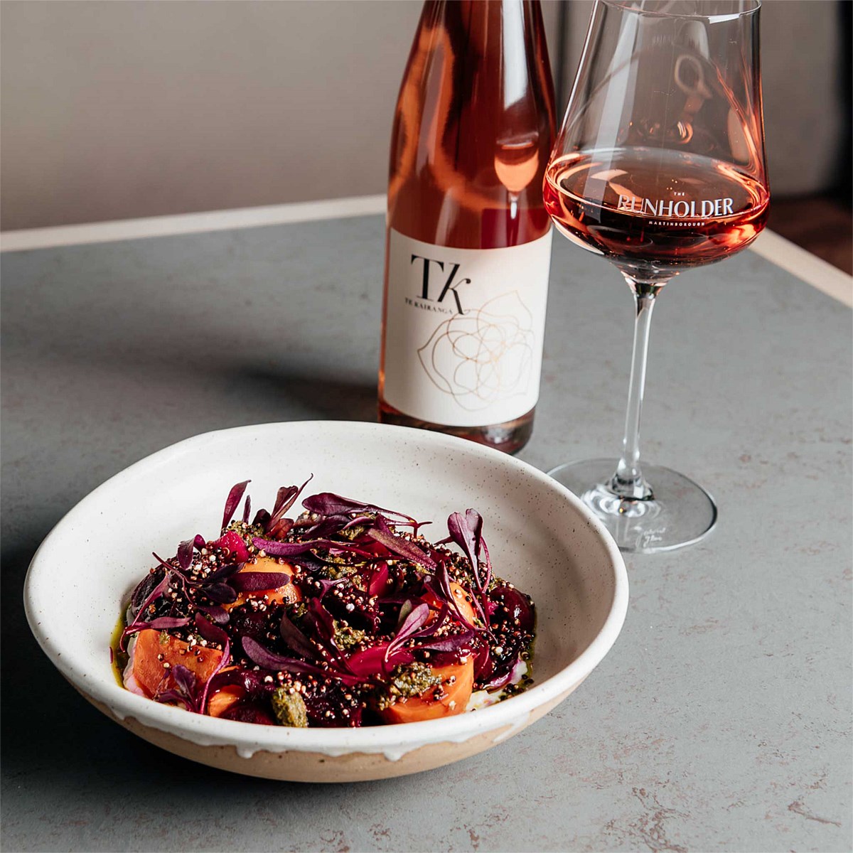 Te Kairanga Estate Pinot Noir Rosé 2025 has fragrant rose petals, fresh strawberries and red cherries flow to a creamy texture on the palate with pops of red berry fruit. Dry in style, our 100% Pinot Noir Rosé has a beautiful fresh palate and a moreish finish. A perfect match for pan seared salmon. Vegan friendly.