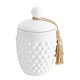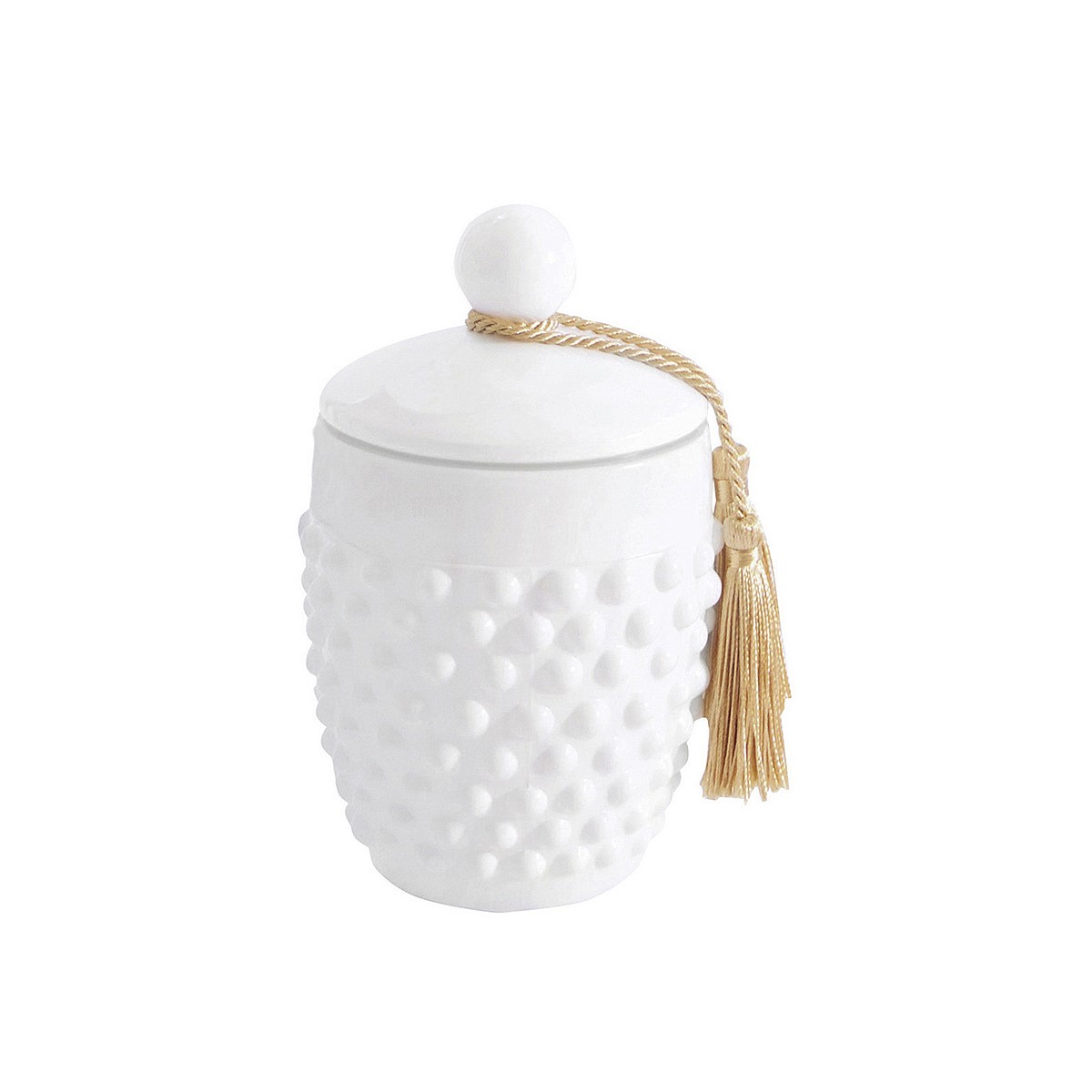 A luxury home fragrance, this exquisite candle features a white hobnail glass vessel, classic white Soy Wax and is embellished with a golden tassel to perfume the air with a signature scent and add style to any space.
