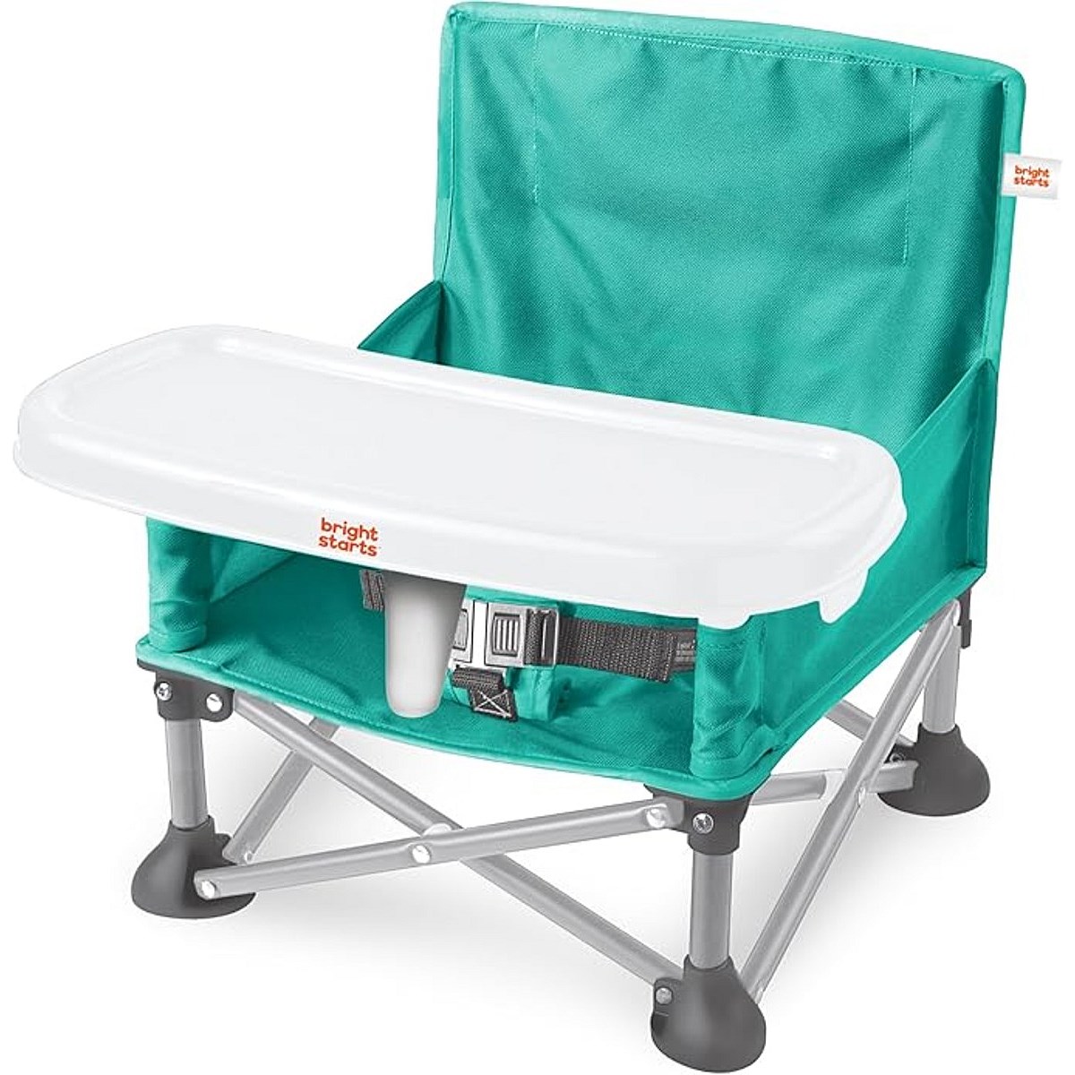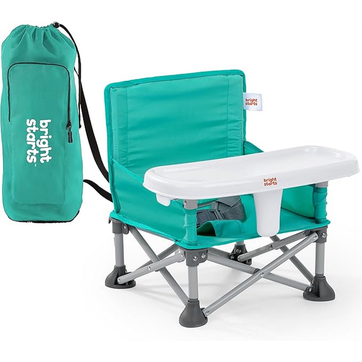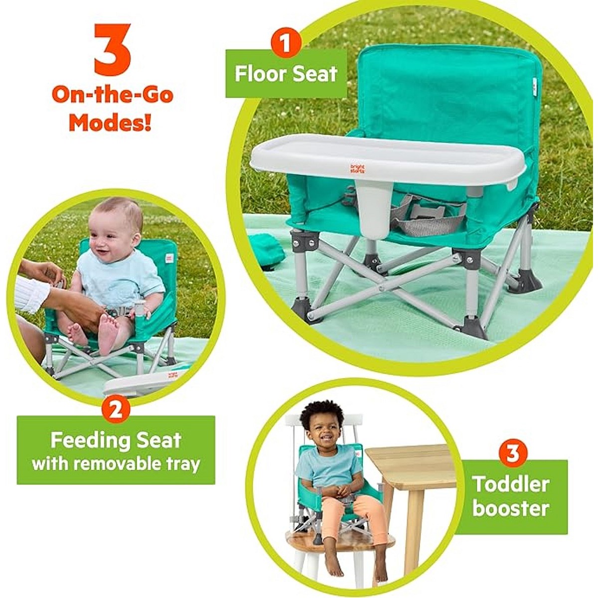 The original Pop ‘N Sit from Bright Starts is the ultimate go & grow seat, with over 2 million sold! From inside to out, baby to toddler, and mealtime to playtime, this multi-purpose travel booster offers your little one a secure place to sit. This #1 Booster* from the #1 Manufacturer of Feeding Boosters** has 3 modes of use: floor seat, feeding seat with removable tray, and toddler booster. For babies, attach to an adult chair using the included straps and BPA free tray to create a portable chair top high chair. For toddlers, use the seat as a booster that can pull up to the table by removing the tray. In floor mode, you can use the Pop ‘N Sit whenever you need an extra seat - picnics, sporting events, or right at home! The rear storage pocket holds your daily essentials. Folds compactly when not in use and includes a carrying bag with shoulder strap. Features a dishwasher safe tray and machine washable seat pad. Dimensions: 15 x 13.5 x 14.75” or 5 x 15” when folded. Made for 6 months to 3 years old or up to 37 pounds. Gender neutral teal color. Third party safety tested and approved. (*Circana, Retail Tracking Service, U.S., Highchairs-Boosters, dollar sales, Jan-Nov 2023 combined); **Circana, Retail Tracking Service, U.S., Highchairs-Boosters, dollar sales, 12 months ending October 2023)