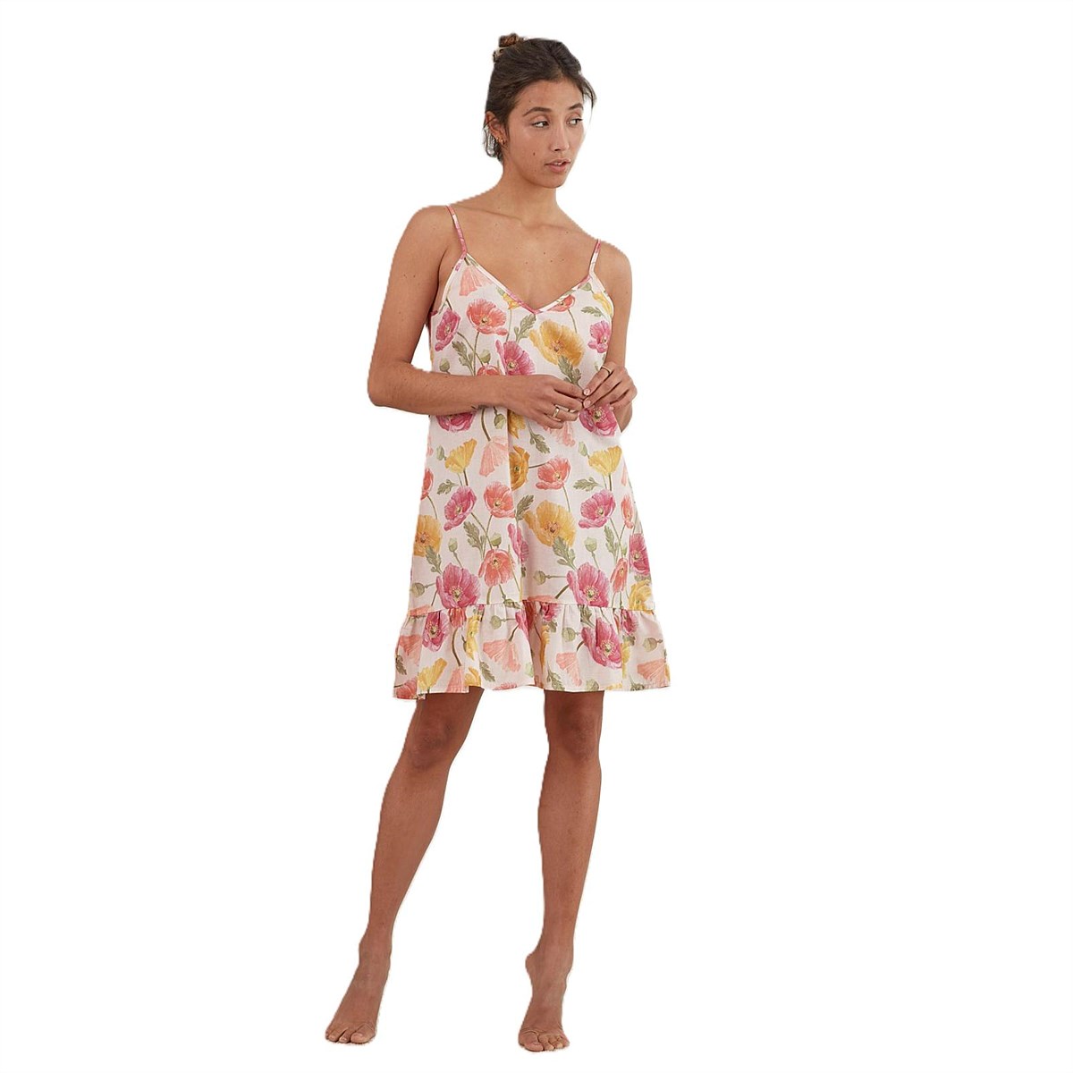 100% Cotton Voile. Digital Print. Poppies printed on a Green or Pink background. Strappy nightie with frilled hem and adjustable straps. Nightie is a smaller print than Robe.