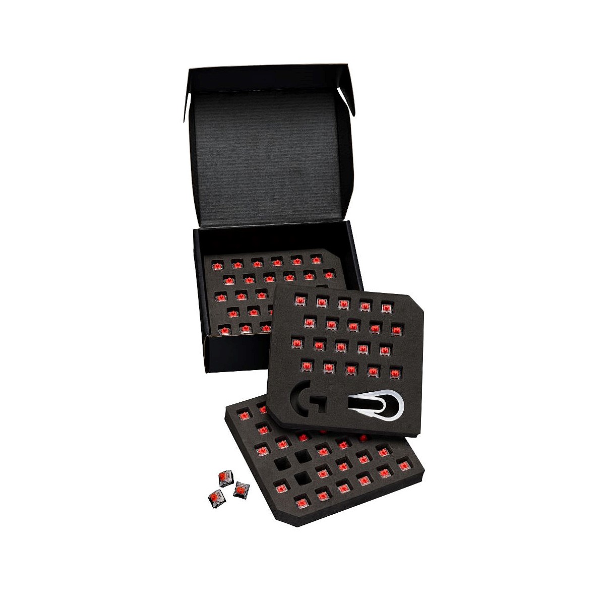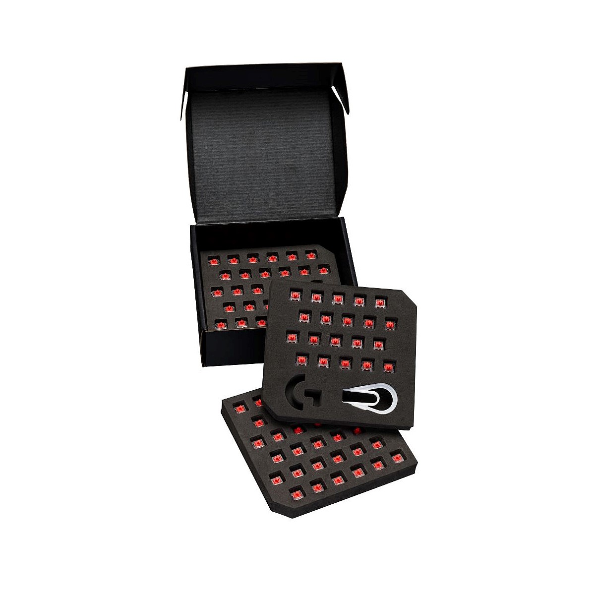 92 switches, one location. The included arsenal keeps all your switches conveniently at the ready, even when they’re not in use. With 92 switches you can replace every switch on your PRO X keyboard with a few to spare! Just easily extract keycaps and switches with the included dual-purpose tool.