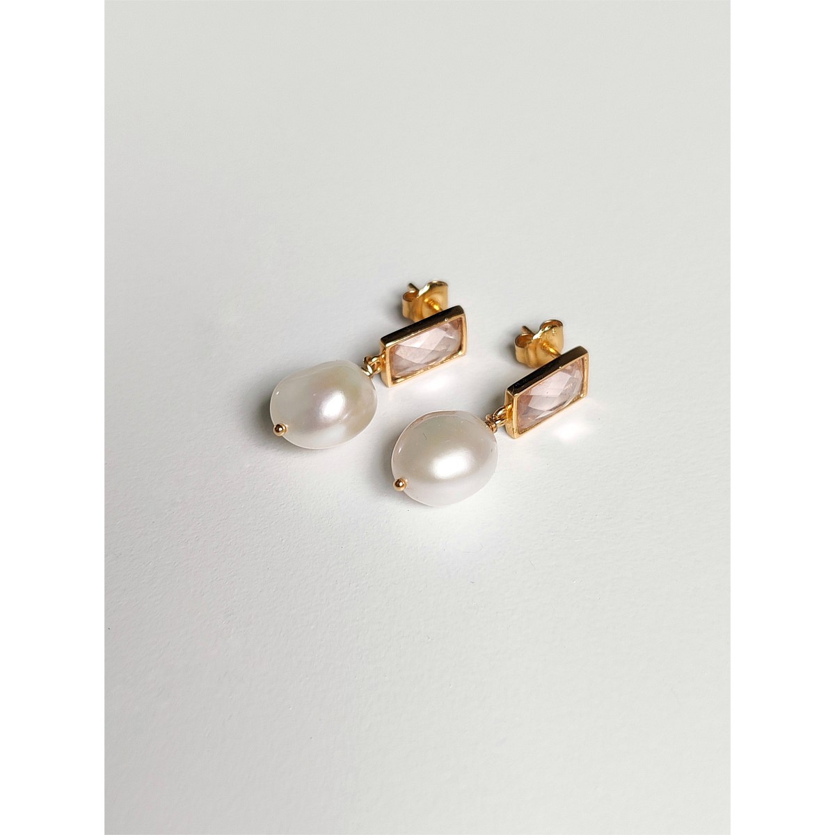 Pave cut Rose Quartz Cubic Zirconia and fresh water pearl drop earrings, set in Sterling Silver with 18k yellow gold plate. Size: 2.5cm drops