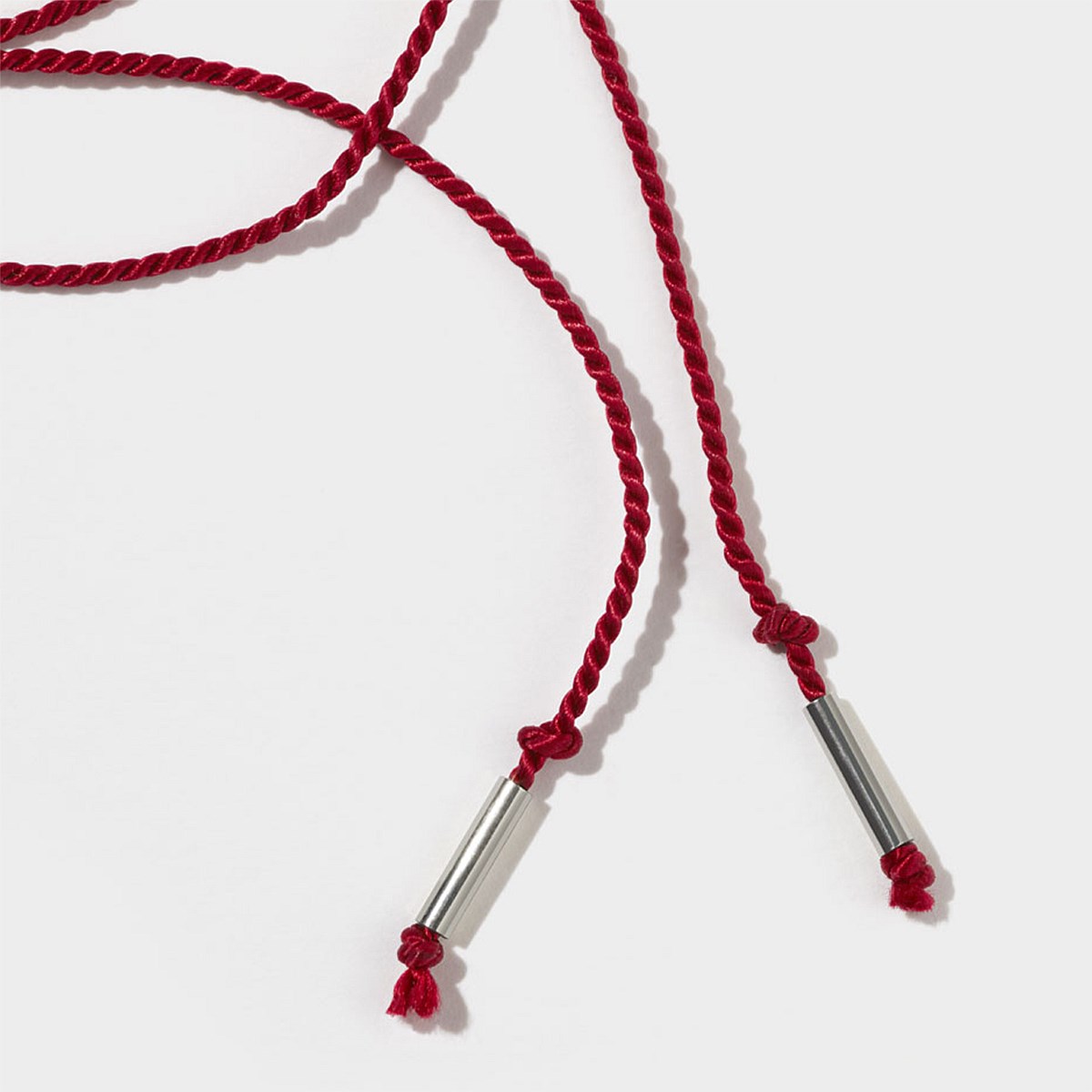 A simple string necklace in fine red silk cord, finished with sterling silver tips. Designed to hold your favourite mementos.