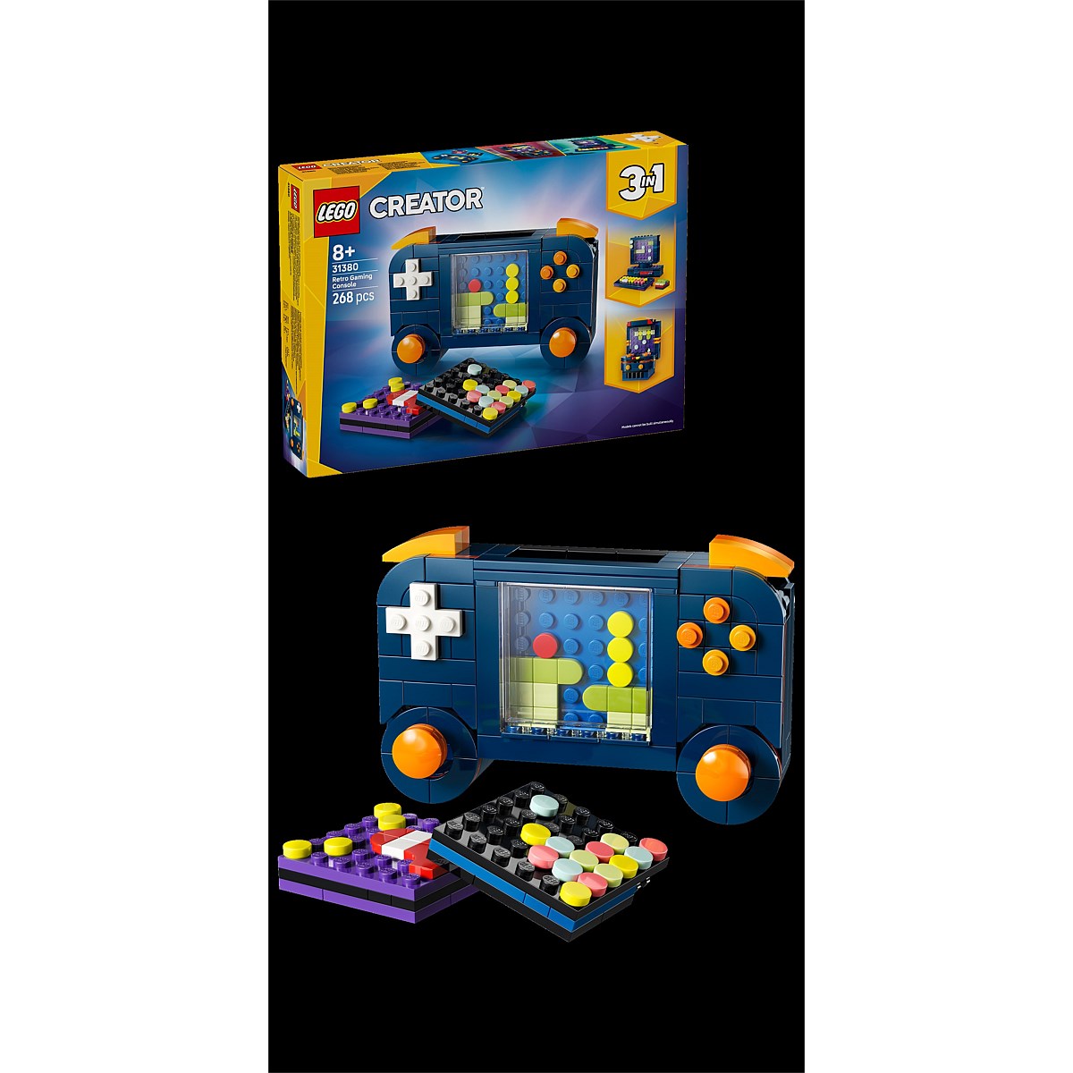 Kids and gamers will love to build, play with and display this LEGO® Creator 3 in 1 Retro Gaming Console building set. This detailed and fun gamer room decor offers 3 different building options with the same set of bricks. Boys and girls can choose to build a handheld gaming console toy with 2 moving joysticks and 2 moving buttons, plus a choice of 3 games cartridges to insert into it. This can then be rebuilt into a desktop mini computer, which includes a keyboard and monitor, a disk to place inside and a mouse, or an arcade game machine. This LEGO Creator 3 in1 set will inspire kids' imaginations and makes a great gift for gamers and nostalgic adults. Please note models cannot be built simultaneously. Set contains 268 pieces.