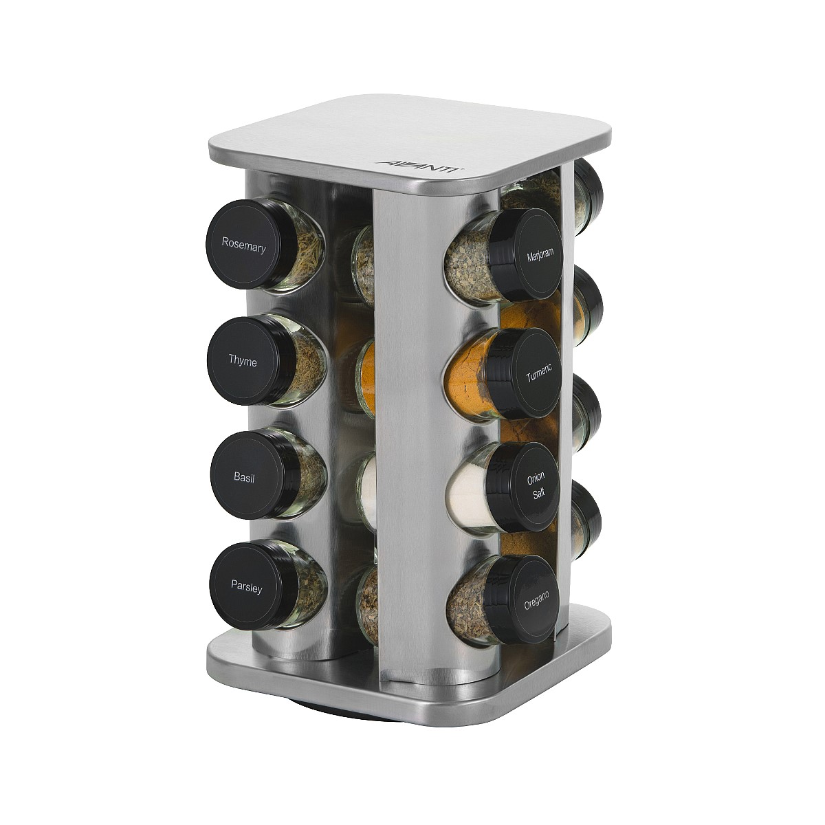 Keep herbs and spices within easy reach with the Avanti 16 Jar Revolving Herb and Spice Rack. Filled with premium spices it is designed to hold 16 jars and sits on the kitchen bench keeping your spices organised and tidy. It features a carousel with a smooth revolving mechanism and labelled stainless steel lids that are lined, making picking out the spice of your choosing, fast and easy. The refillable glass jars have a screw-top lid to keep your herbs and spices fresh and a shaker top to control the amount of spice used.
