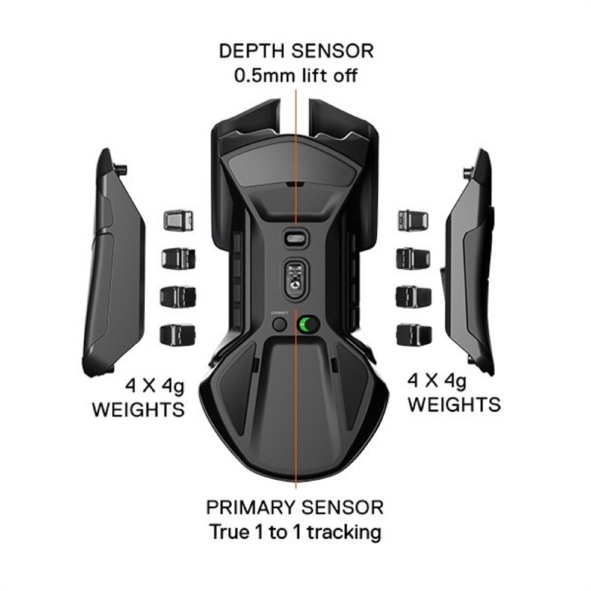 The all new centre of gravity tuning system includes moveable weights and light-to-heavy customisation, delivering the widest range of adjustment of any gaming mouse. Centre of gravity weight combinations for the perfect balance of any grip or game play style. Removable sides allow easy and secure placement of the eight included 4g weights.