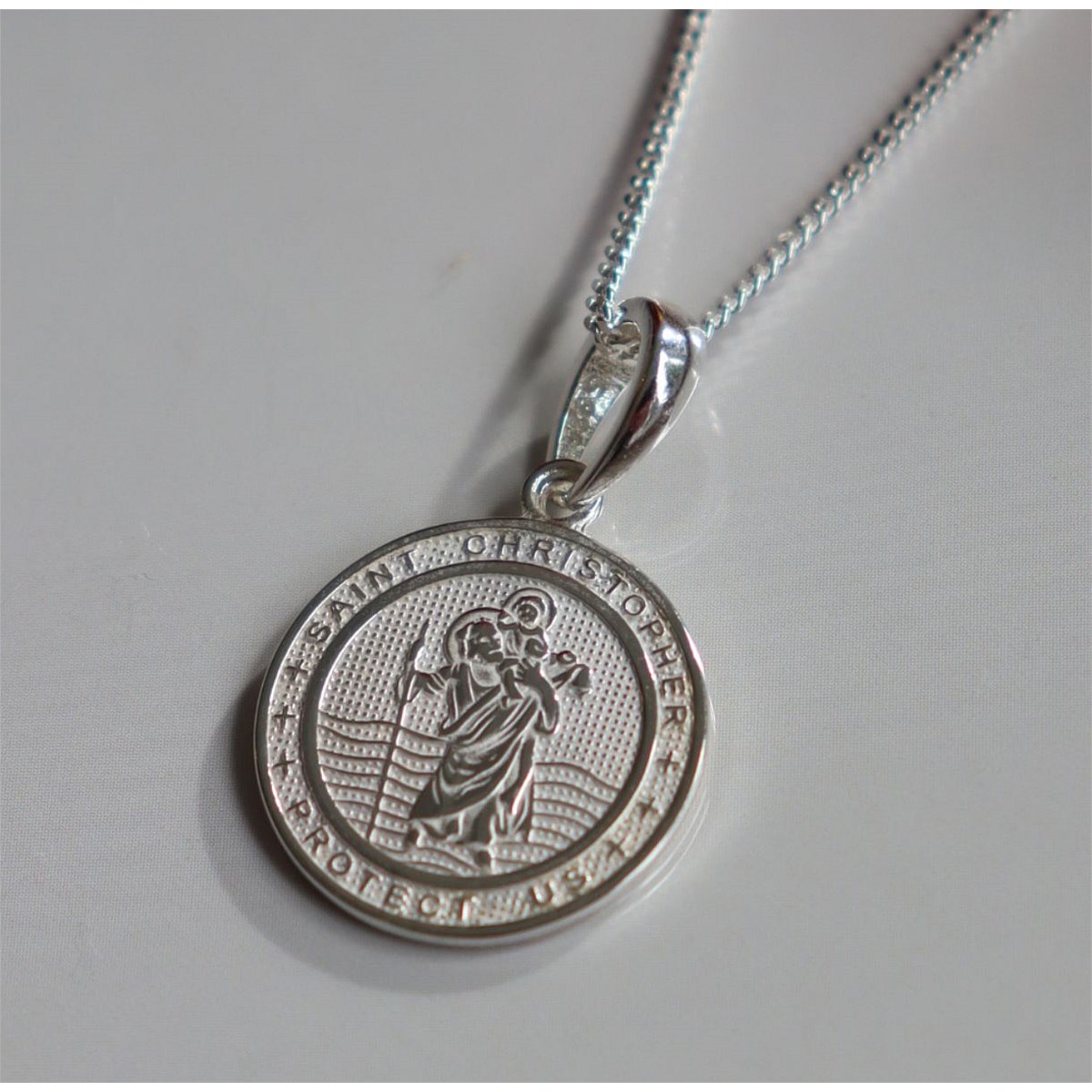 Crafted in sterling silver this Saint Christopher pendant sits on a 45cm chain with a 5cm extender. This design is suitable for both men and women and is a short style, created to sit on the chest. The pendant features Saint Christopher, with the wording "protect us", making it a perfect gift for those embarking on new journeys. The back is blank, so there is room to engrave a special measure if you wish.
