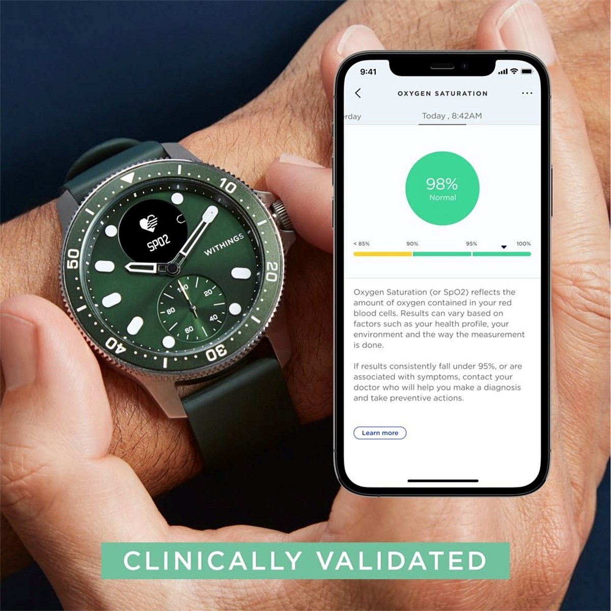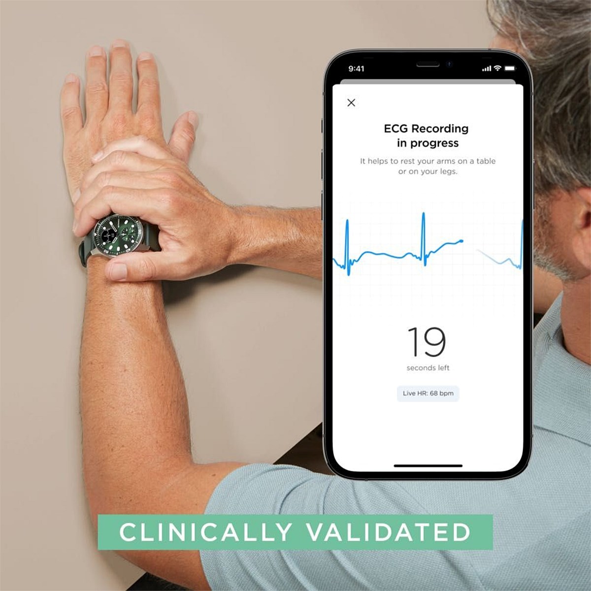 ScanWatch Horizon combines iconic diver watch design with breakthrough health tech. Nested in a high-end watch, state-of-the-art medical technology has been carefully selected to create the most health-oriented watch ever offered to the public. Developed with cardiologists, and clinically validated, this is the world’s first hybrid smartwatch that can alert a user to a possible case of atrial fibrillation or breathing disturbances. ScanWatch also offers in-depth activity and sleep tracking, water resistance to 100m, and an exceptional battery life of up to 30 days before it needs to be charged.