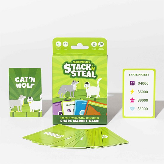 Buy low, sell high, and play Cat ‘n Wolf cards to flip the game in your favour. Buy and sell shares, outsmart market events, leverage Fat Cat advantages, and watch out for sneaky Wolf attacks. Stack ‘n Steal brings the chaos of the share market to your living room in under 20 minutes.