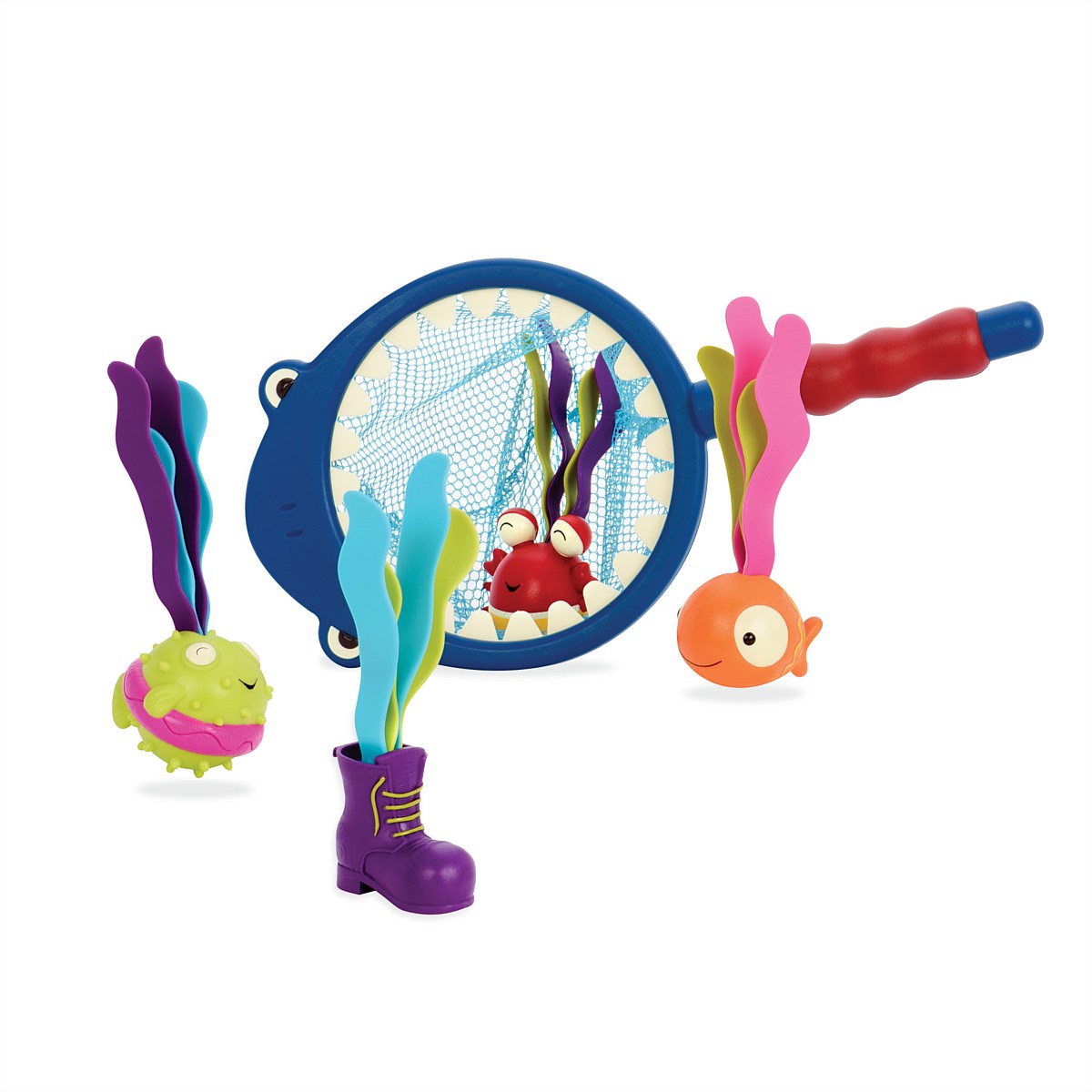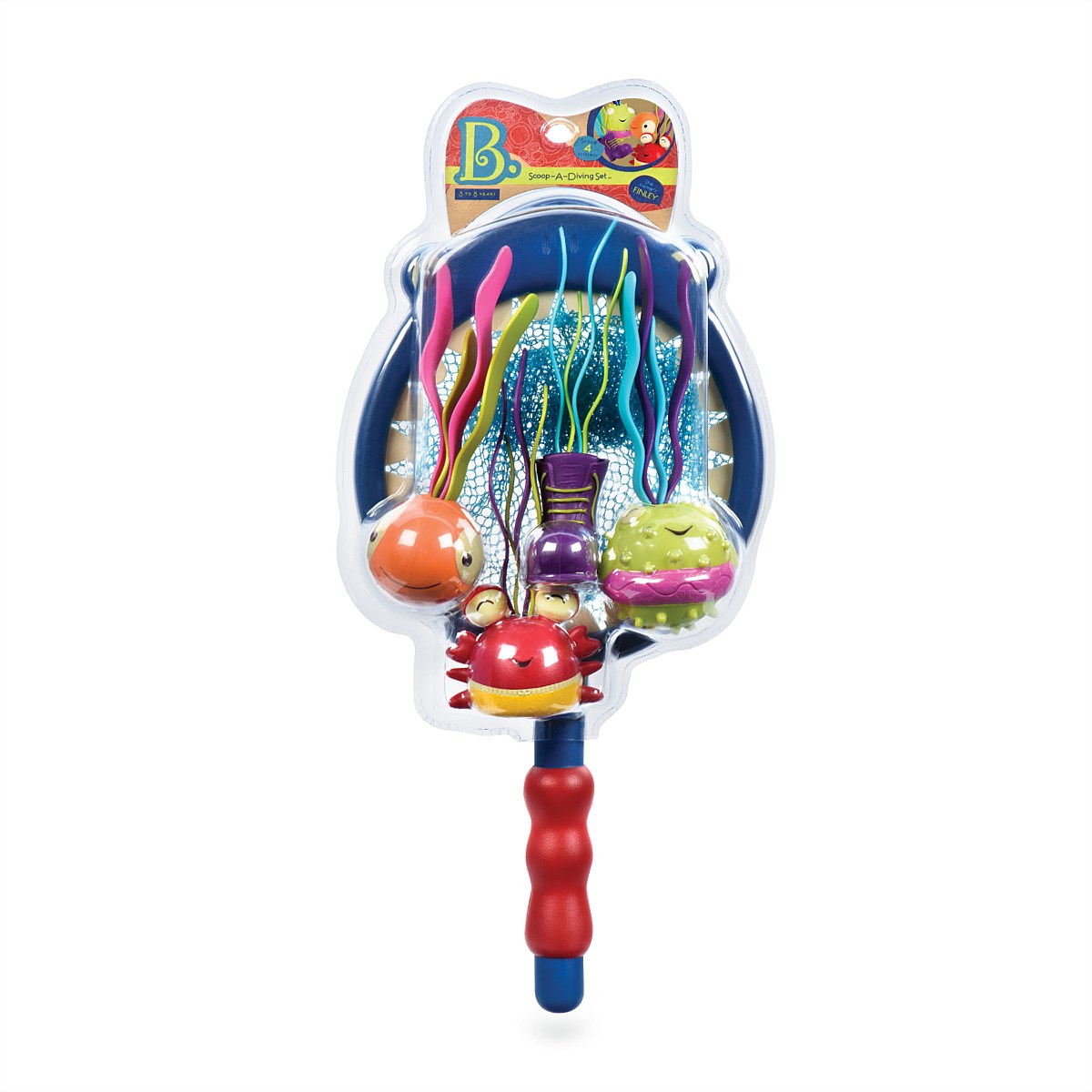 Toss the 4 weighted diving toys in the pool and dive down with the mesh net! Scoop ‘em up or grab ‘em by their grassy hair! it’ll be a summer to remember with fun pool toys! All 5 swimming pool toys feature an easy-to-grab grip; perfect for tiny swimmers.
