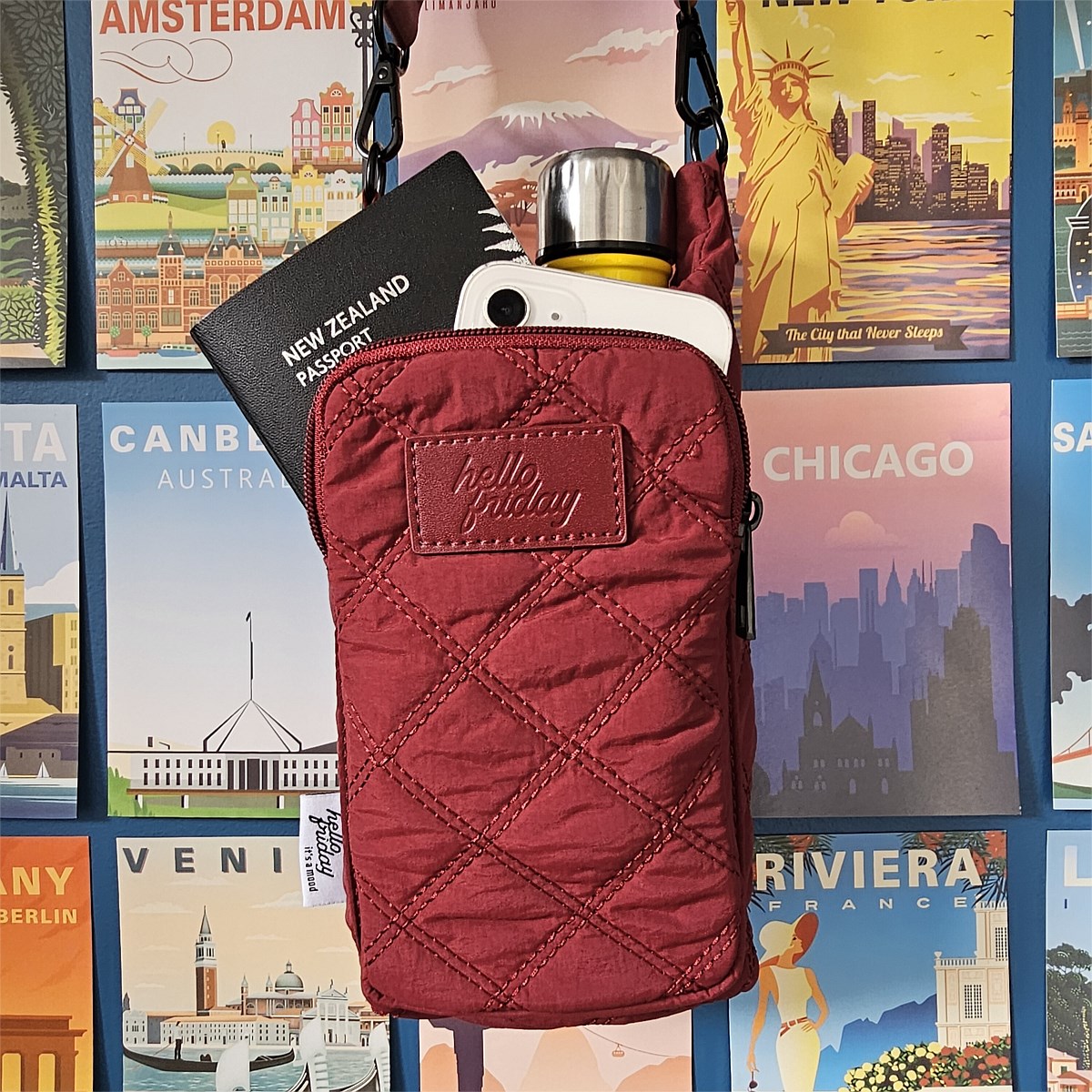 - Main compartment fits a standard bottle and everyday essentials such as a glasses case, keys, phone, passport, and cards