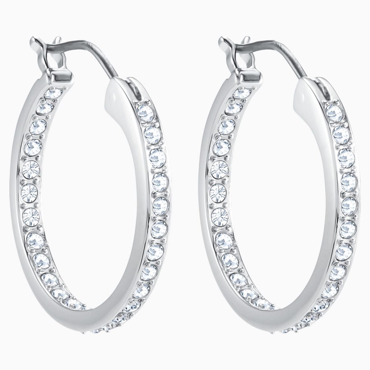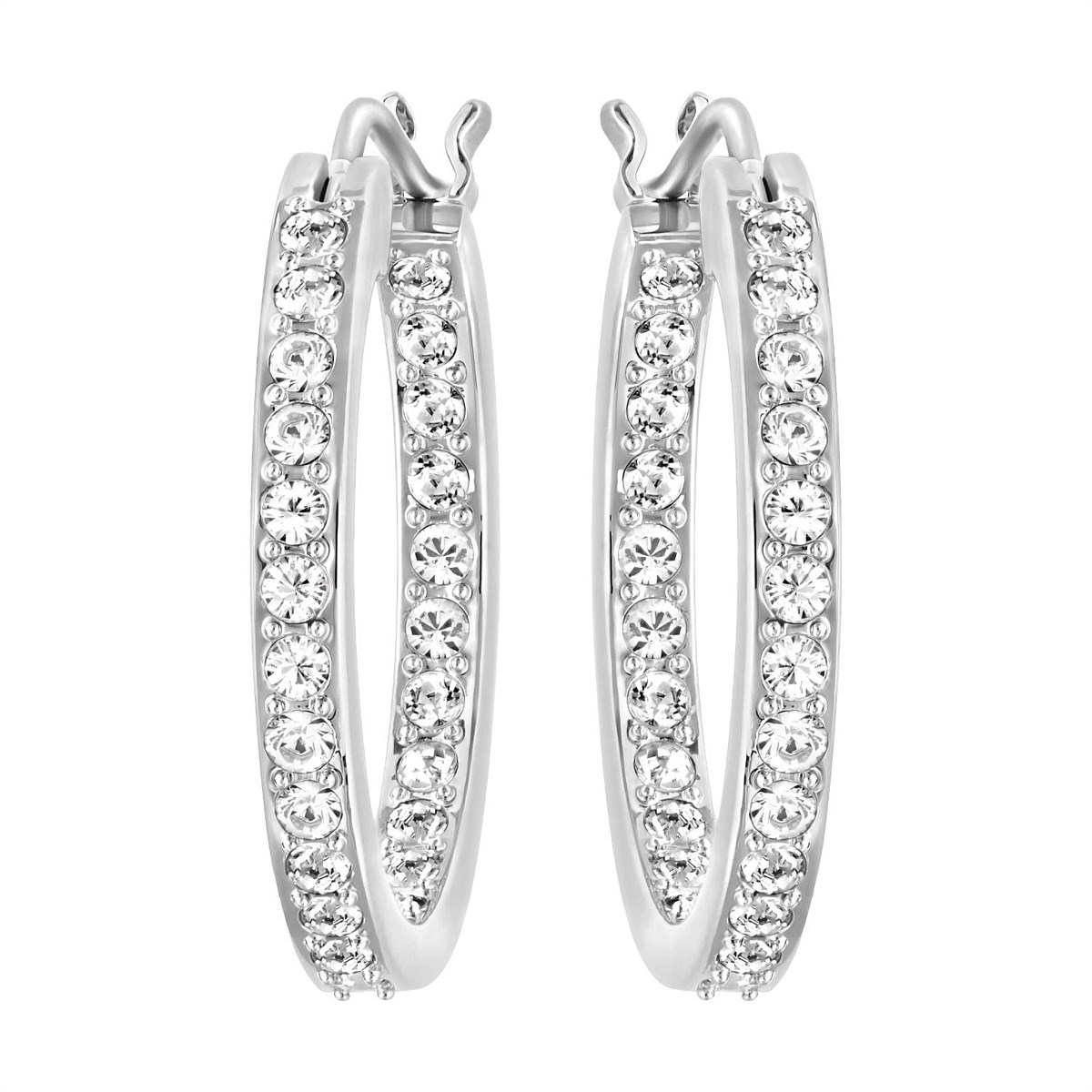 This classic pair of earrings is easy to wear on any occasion. The outer edge of each rhodium-plated hoop is delicately embellished with clear crystal pave, lending a soft sparkle to this timeless design.