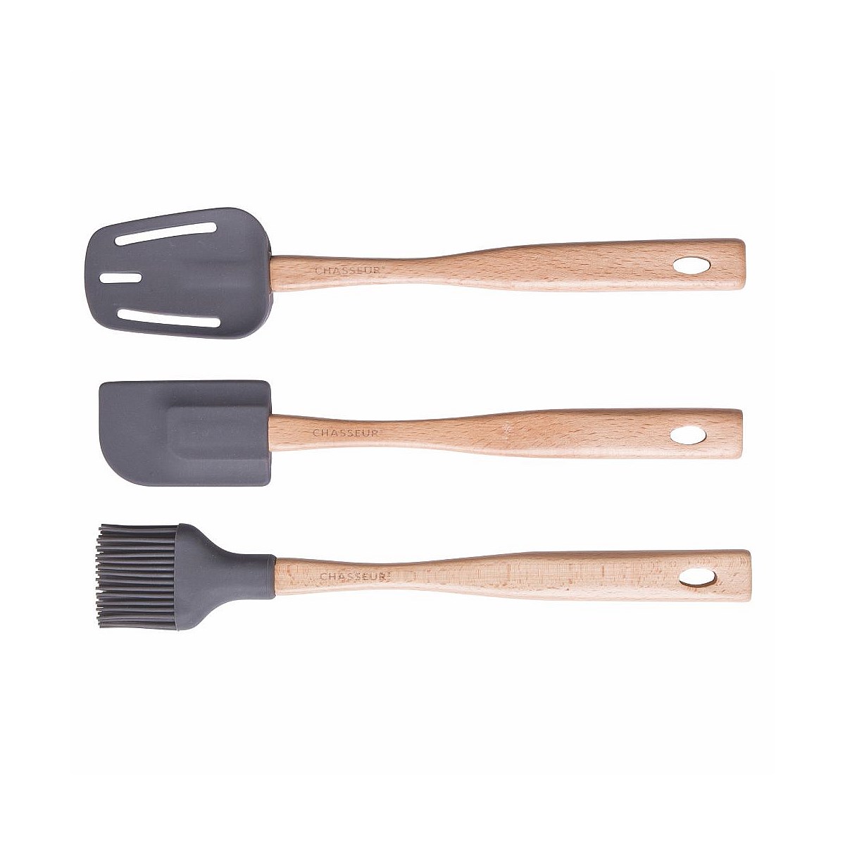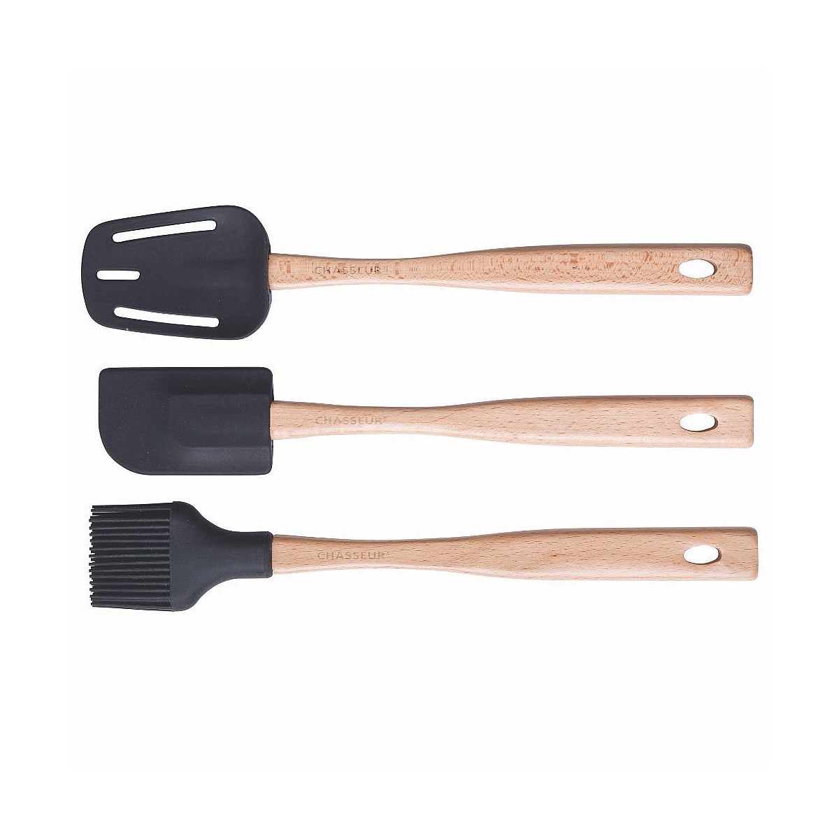Keep these frequently used tools handy with the Chasseur 3-piece silicone tool set. The set includes a slotted spoon, a spatula, and a basting brush. Made of high quality silicone heads that won't scratch your cast iron enamel cookware, these tools are made with ergonomic and elegant beech wood handle. They're easy to clean too, simply take off the head from the handle and put in the dishwasher. Note that the wooden handles are not dishwasher or oven safe. It comes in colours that beautifully complement your cast iron or stoneware collection.