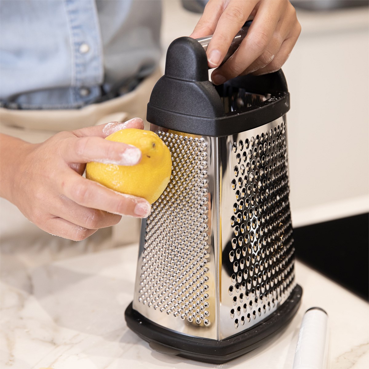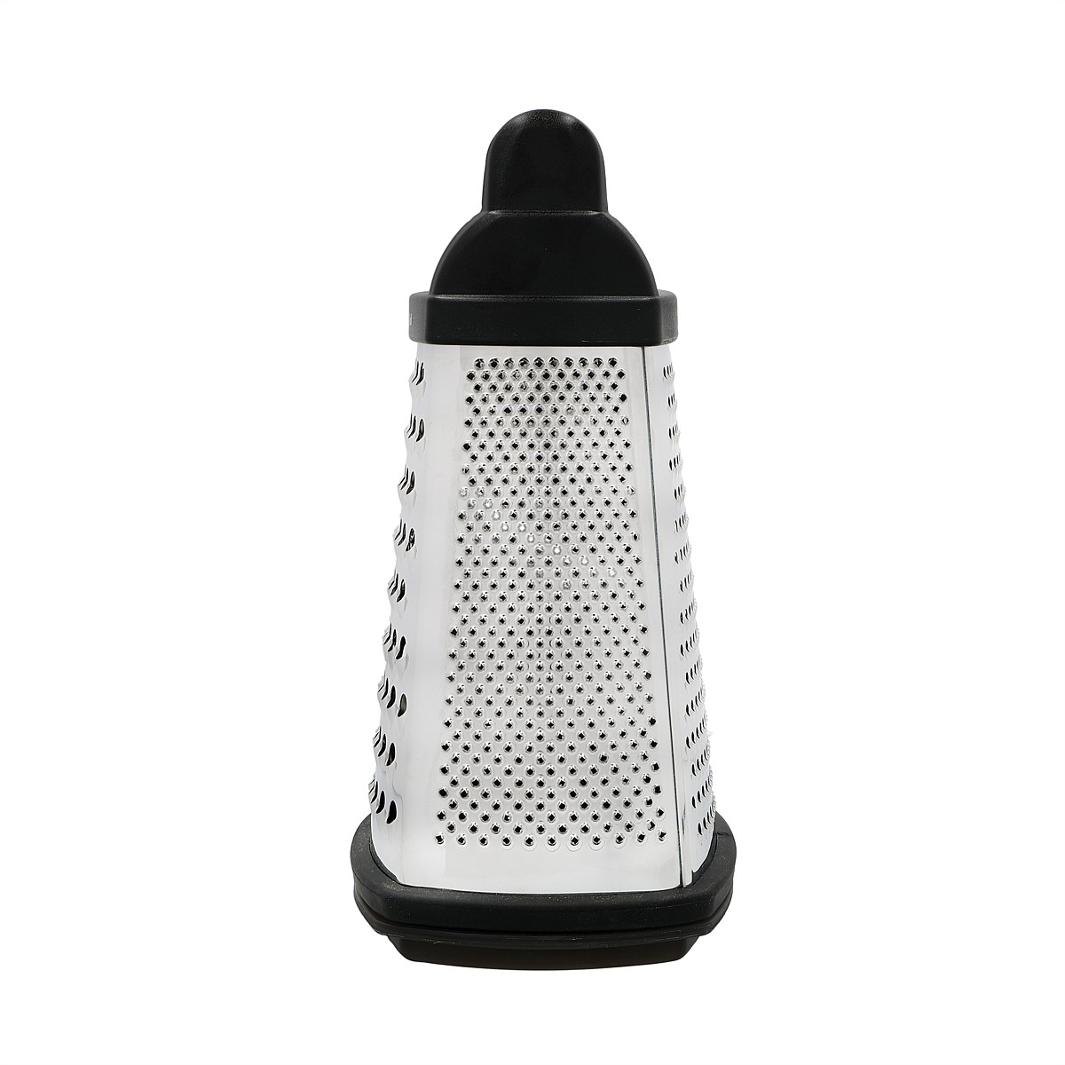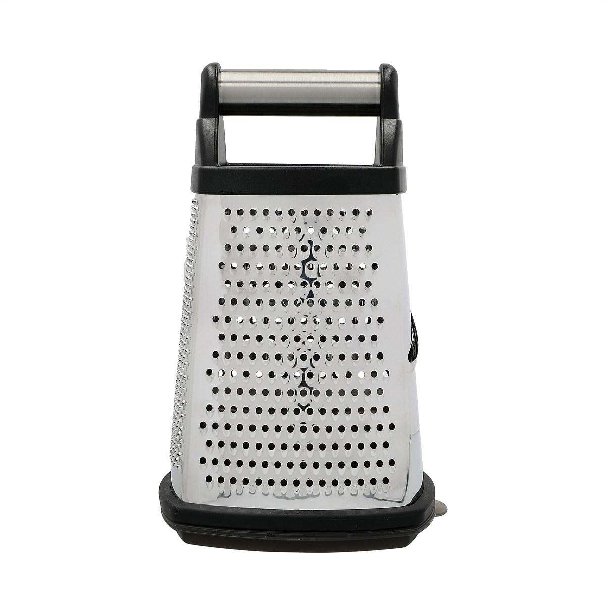 The box grater has four different blades to slice or grate