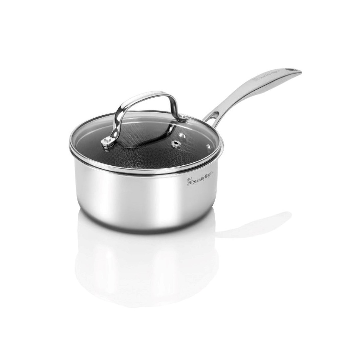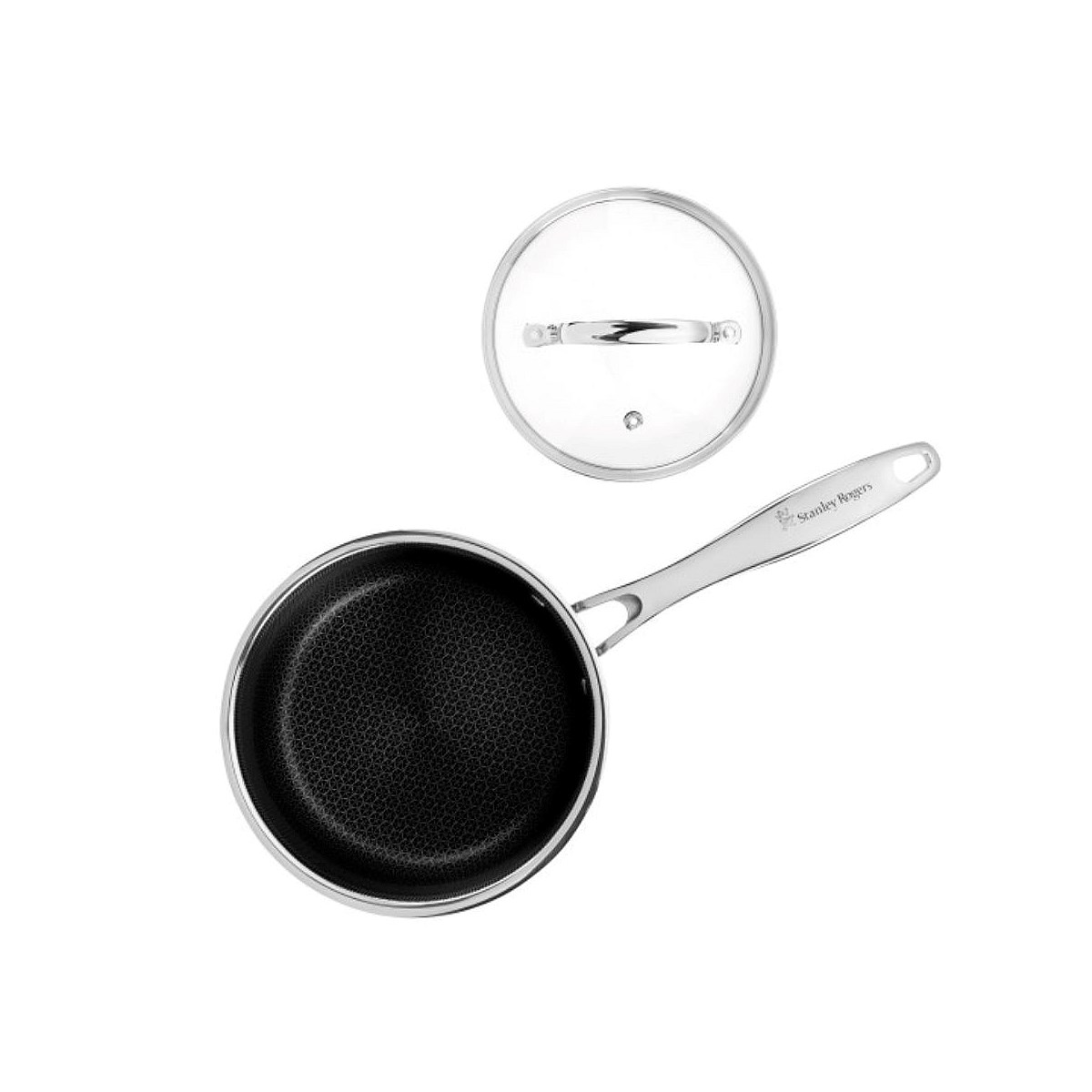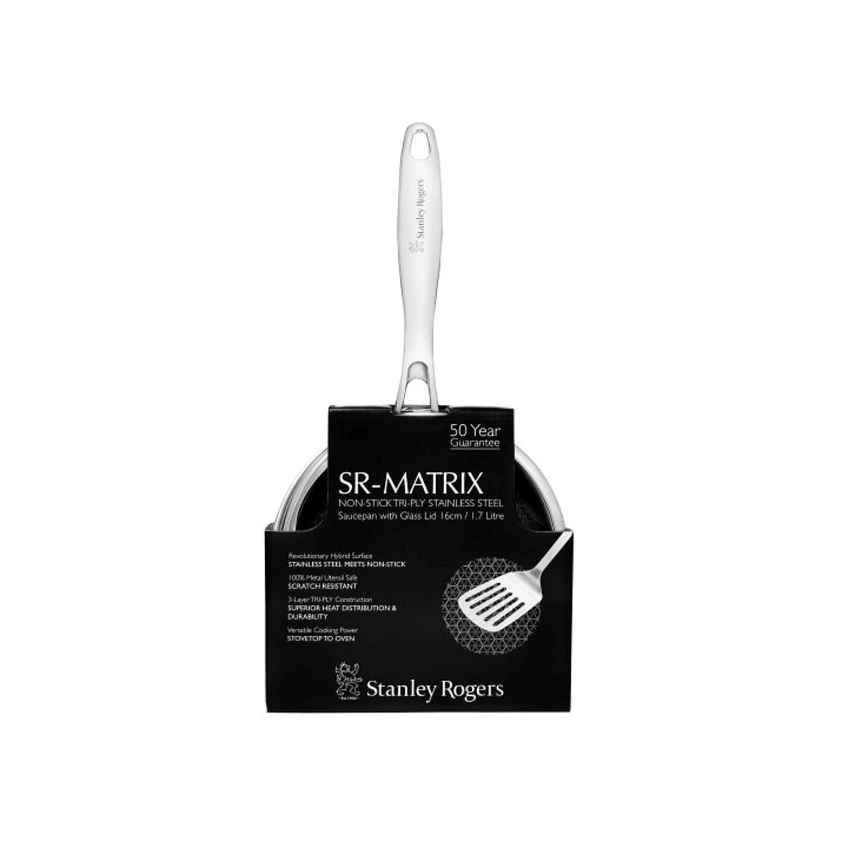 Stanley Rogers SR-Matrix Non-stick Saucepan 20cm with Glass Lid uses a revolutionary non-stick with protective stainless steel matrix. 100% metal utensil safe. Hybrid performance of stainless steel and non-stick - great for searing and browning with the benefit of non-stick.