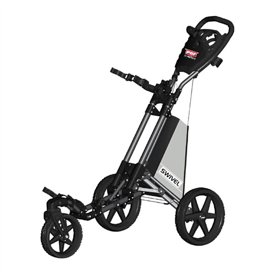The PGF Status Swivel Buggy features 12” wheels for a smoother roll and more stability over uneven ground. The PGF Status Swivel retains all the best features that made it a best-seller: The combination of the 360? swiveling front wheel and large, new design 12” diameter 5-spoke slick wheels allow the Swivel to glide effortlessly while features like the high-volume 2-pocket storage silo and multi-function scorecard holder add functionality and usability. The PGF Status Swivel also features super struts for stability and sturdiness and an ultra-reliable down-up footbrake.