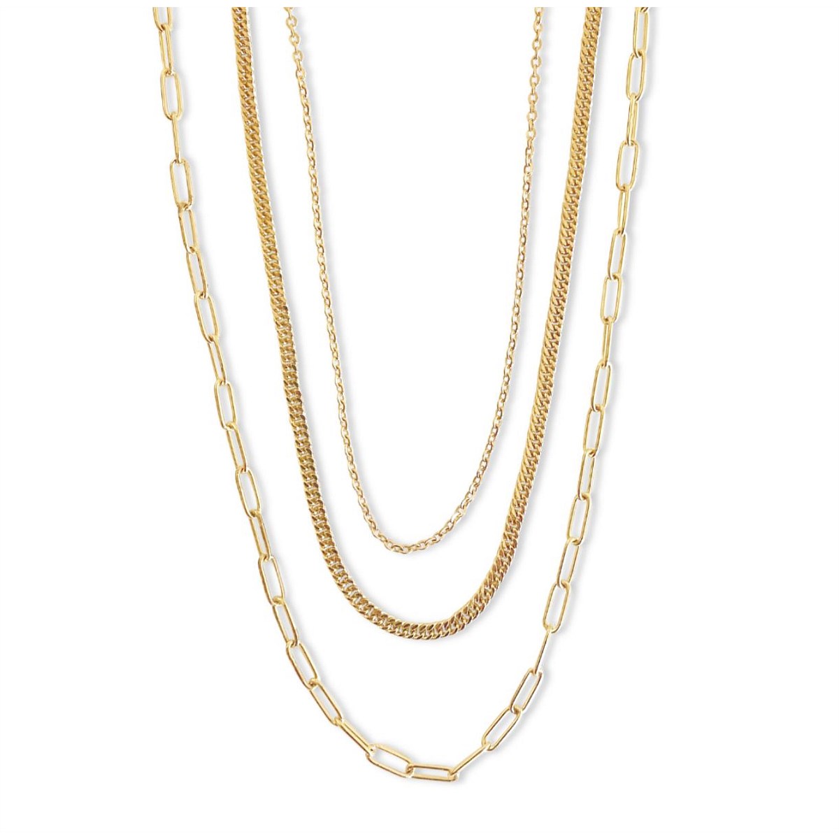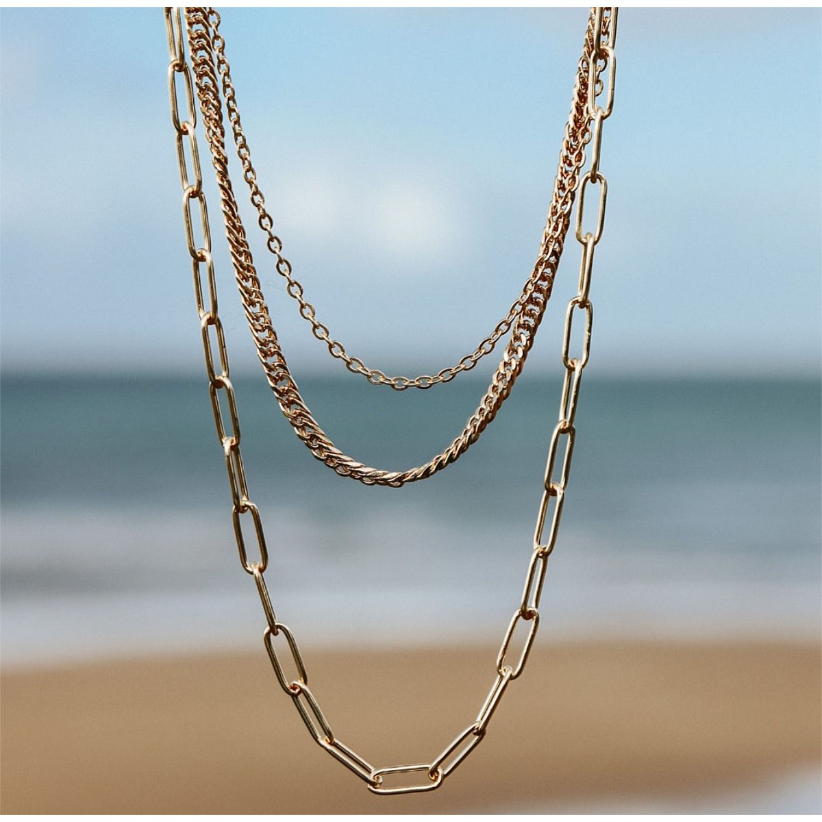 The three chain lengths are 40cm, 45cm and 50cm. A 5cm extender chain is also attached so you can wear the necklace at your desired length.