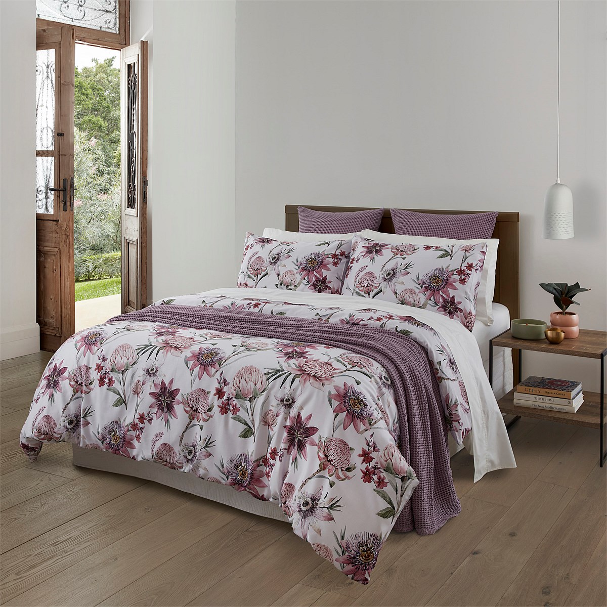 Embrace the beauty of nature with the Sugar Bush Duvet Cover Set, featuring a protea (sugarbush) digital print on a beautiful lilacberry background.