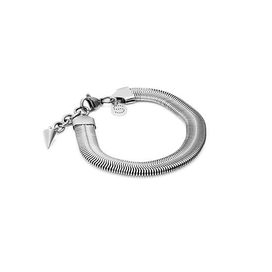 Introducing the Silk & Steel Sundowner Bracelet in high-polished stainless steel. This slinky, wide, snake chain bracelet captures the essence of 90s cool with its modern, silver tone that is trending in jewellery right now. Draping beautifully over the wrist, it moves fluidly with every gesture, adding a touch of edgy-luxe sophistication.