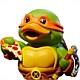 His orange bandana is firmly in place and he has his nunchaku at the ready should he need it.