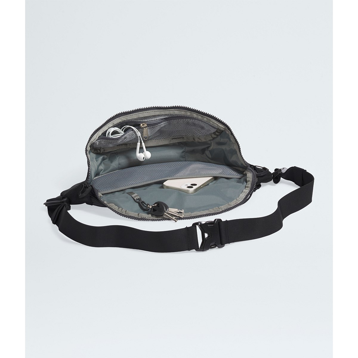 - Zippered main compartment for larger items such as a water bottle, phone, wallet, and keys