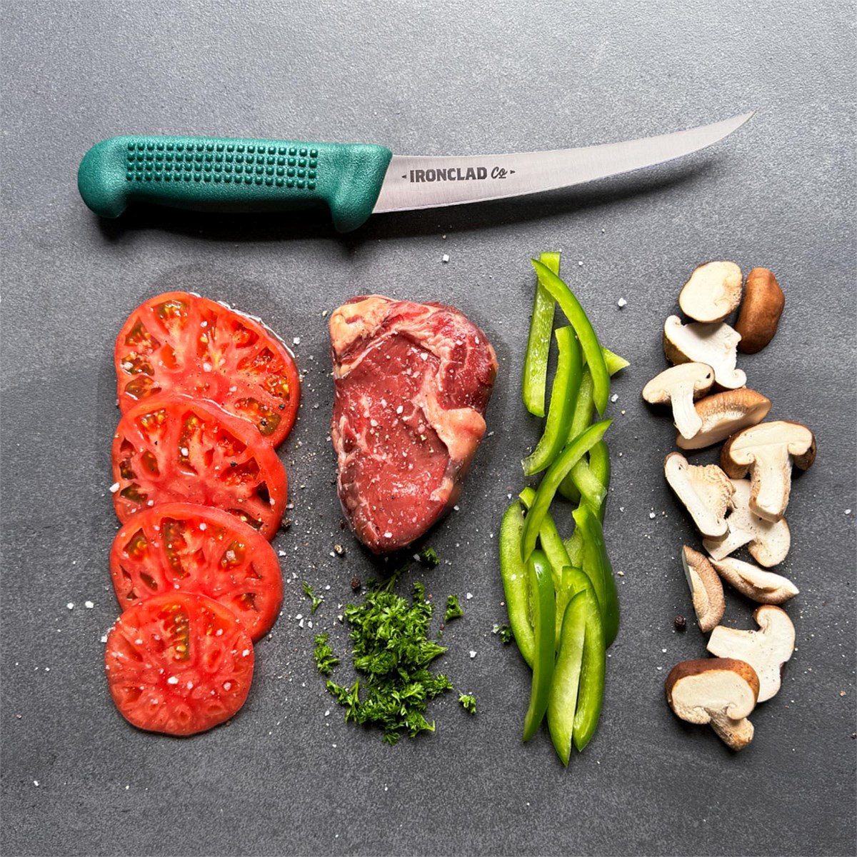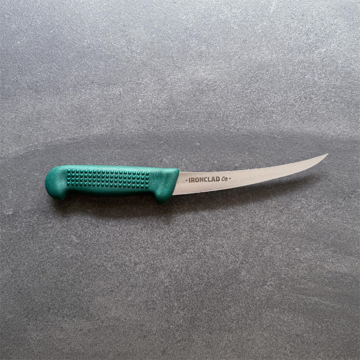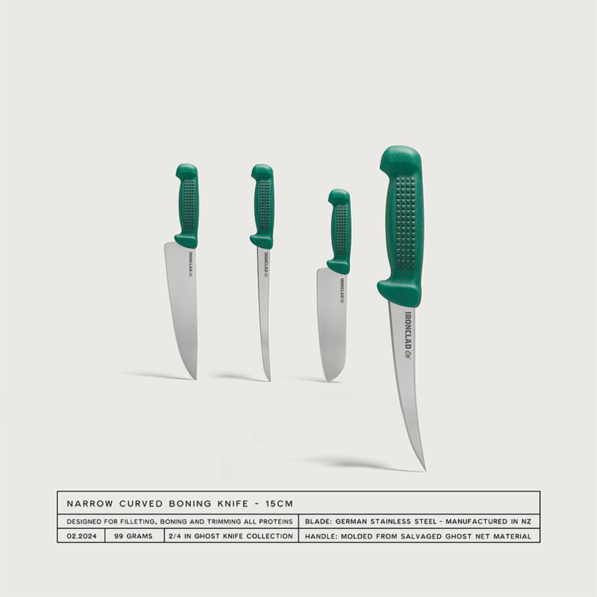 The 15cm Boning Ghost Knife from Ironclad Co. is designed for accuracy and control, featuring a razor-sharp Victory Knives blade and an ergonomic handle made from salvaged ghost nets.
