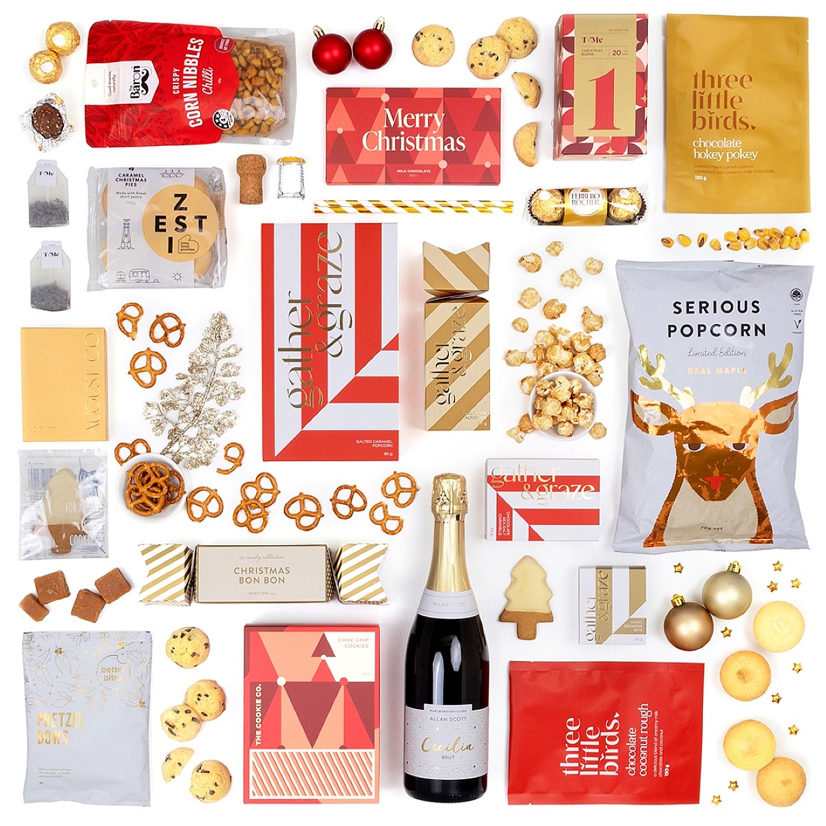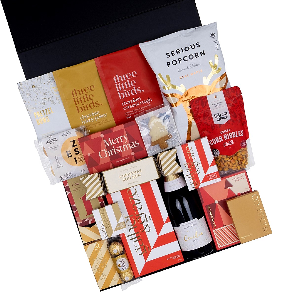 Raise a glass to the season with The Christmas Cheer, a festive collection of sparkling wine, artisan sweets, and Christmas classics. This hamper is brimming with holiday favourites, from rich fudge and decadent chocolates to gingerbread, mince pies, and savoury nibbles. Finished with a celebratory bottle of Allan Scott Cecilia Brut, it’s a thoughtful and generous gift made to spread joy and bring people together at Christmas.