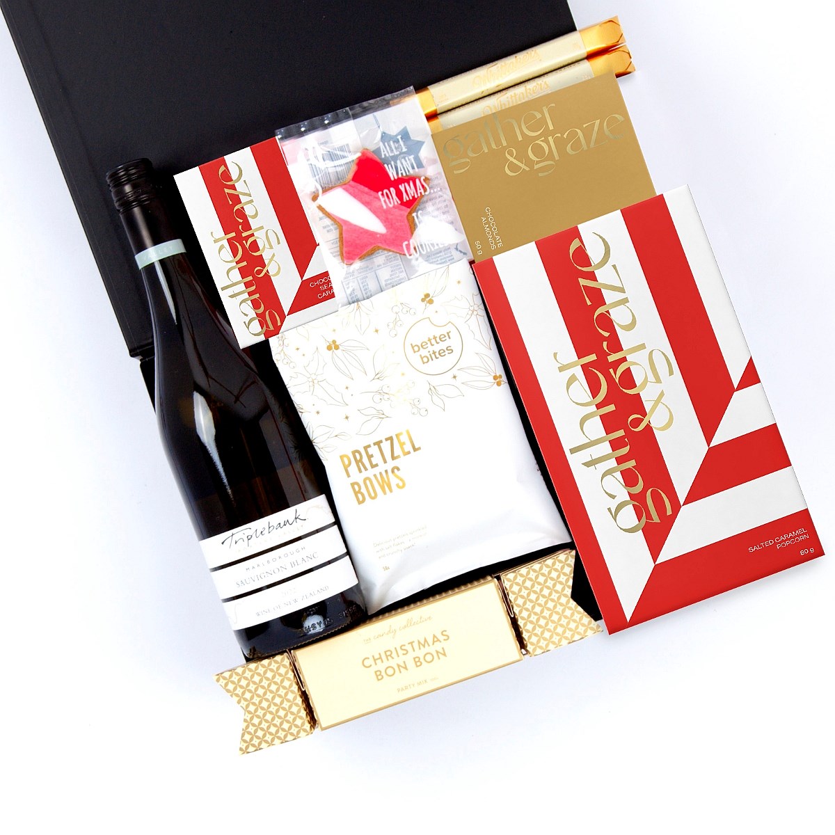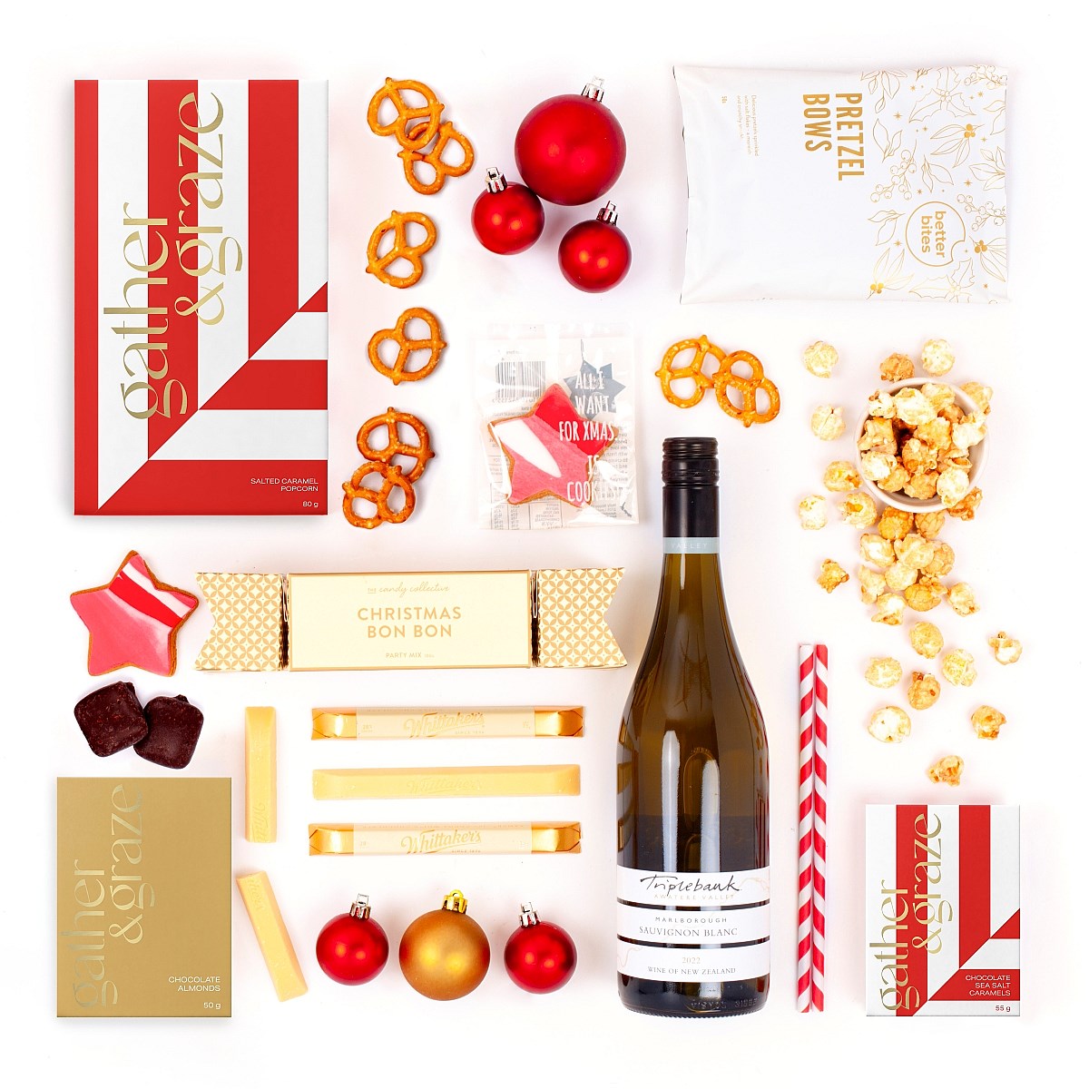 Bring the joy of the season with The Festive Feels, a cheerful mix of wine, Christmas sweets, and festive nibbles. Featuring a bottle of Triplebank Sauvignon Blanc alongside artisan chocolates, gingerbread, popcorn, and party mix, this hamper is made to share and enjoy during summer gatherings. A thoughtful gift that captures the flavours of Christmas and spreads a little cheer with every bite and sip.