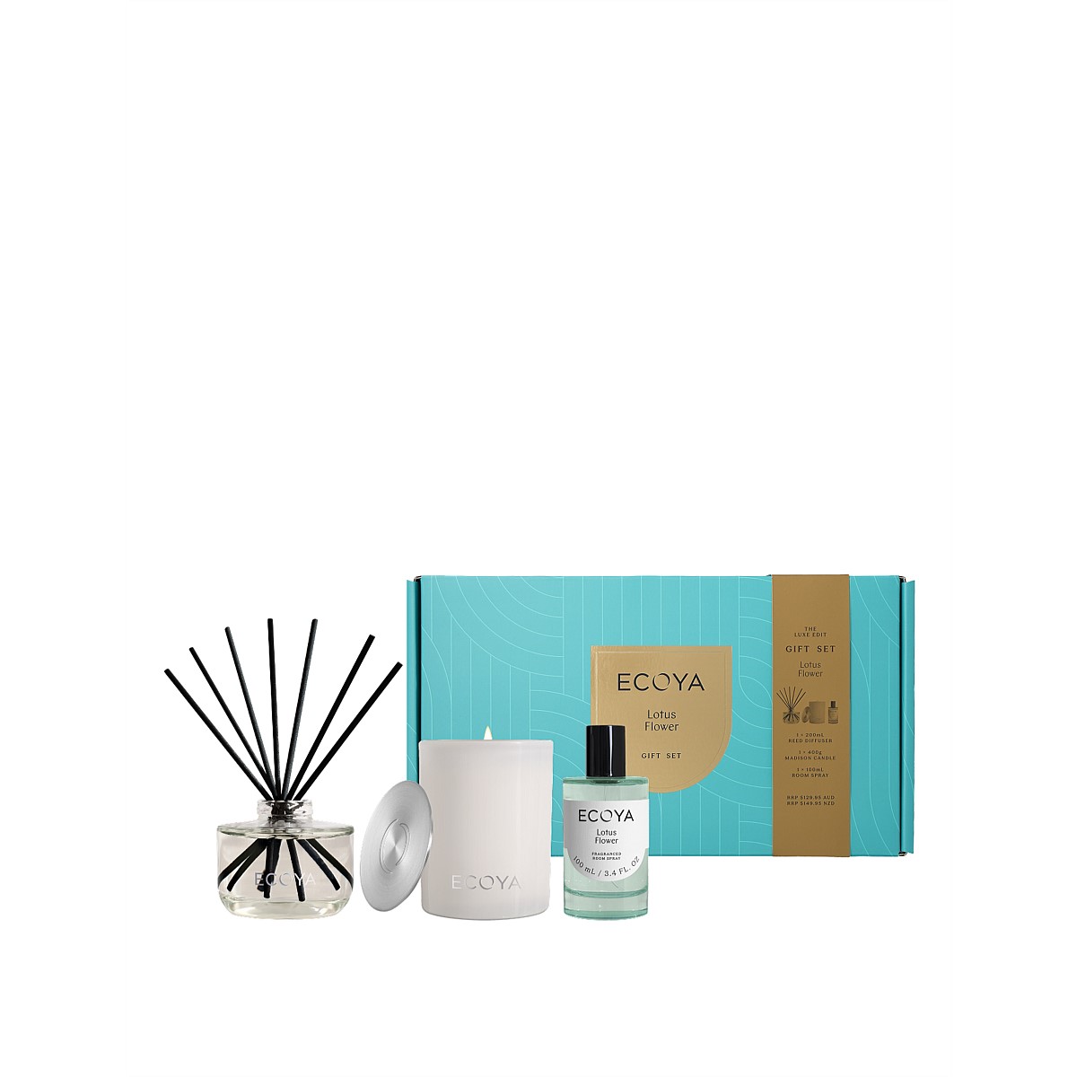 The complete ECOYA experience, in one beautifully curated set. A gift-worthy trio featuring our iconic Madison Candle, chic Reed Diffuser and bold Room Spray, all in the signature Lotus Flower fragrance. Perfect for those more special occasions, this luxurious set is designed to be gifted. Layer them, rotate them, or use them solo, this trio has been designed to scent your space with style and ease. One fragrance. Three ways.