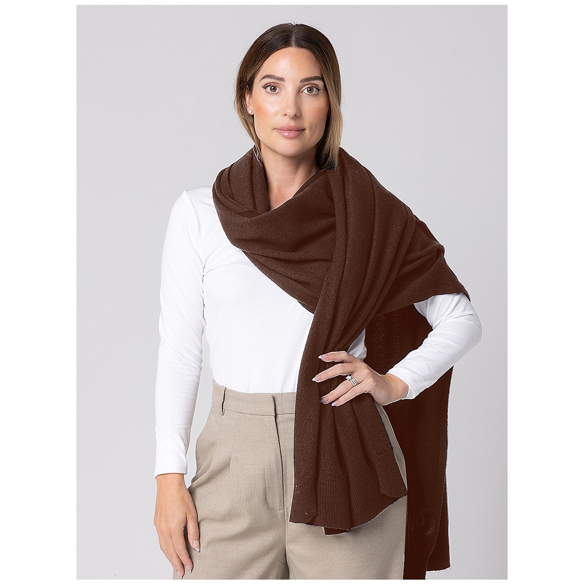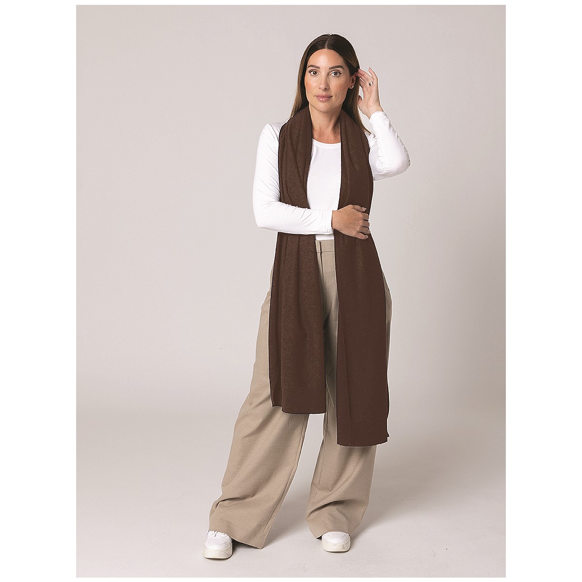 A stunning wool scarf in warm chocolate brown.