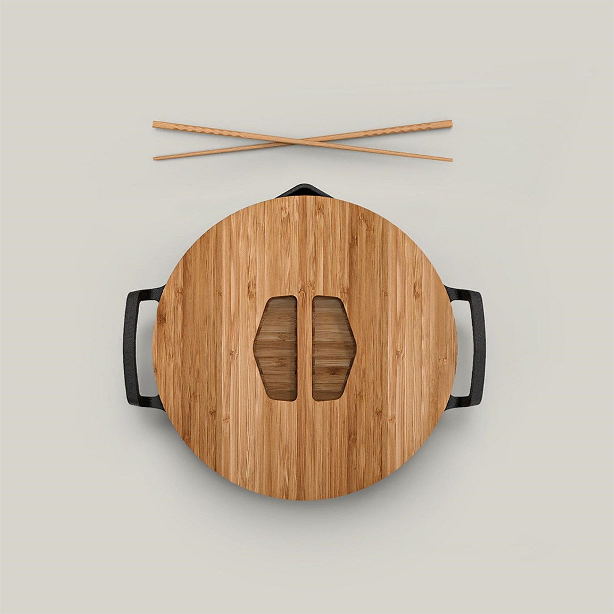 Each set includes a hand finished cast iron wok, a bamboo lid that doubles as a serving board, and