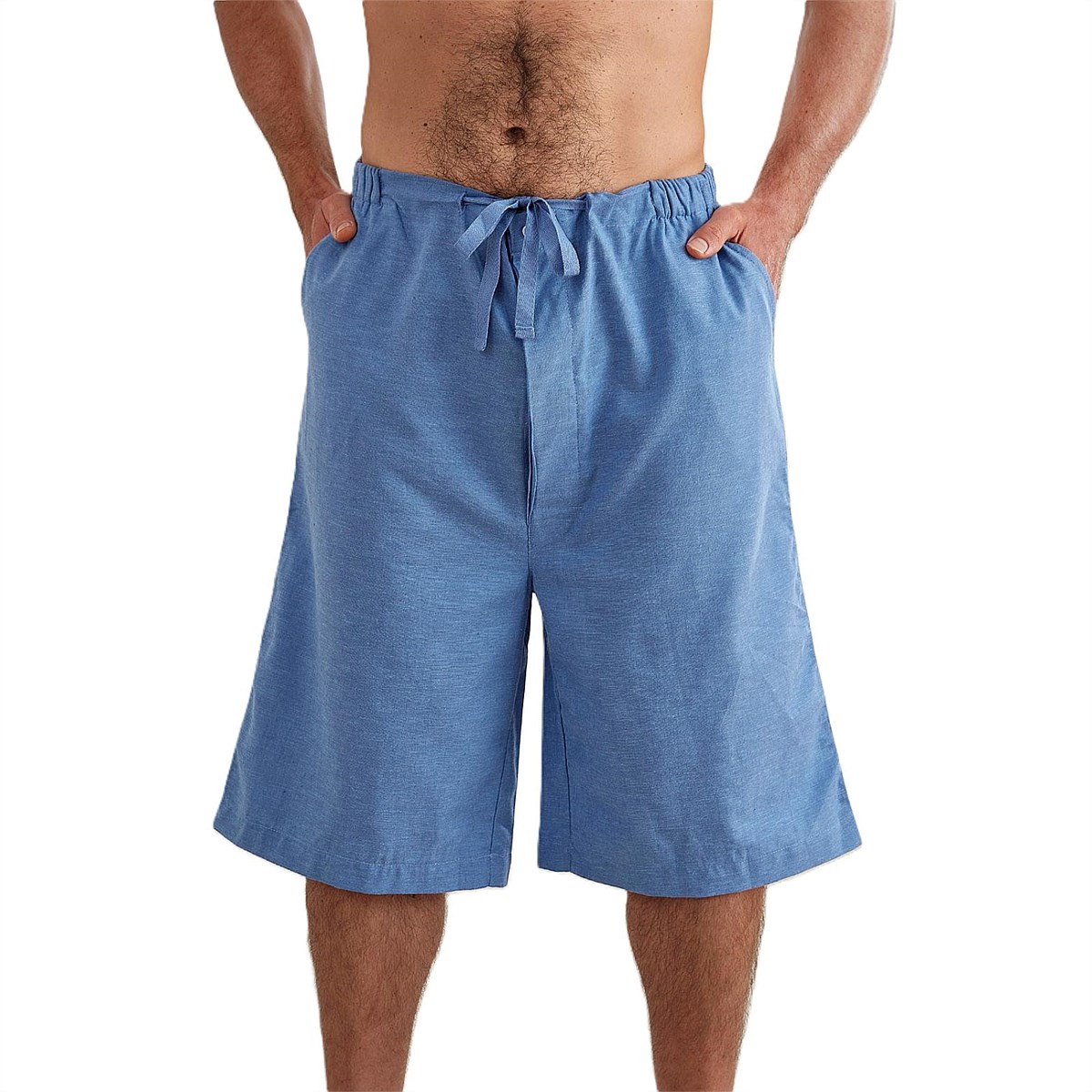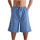 Dark blue shorts feature an elasticated waistband and side pockets.
