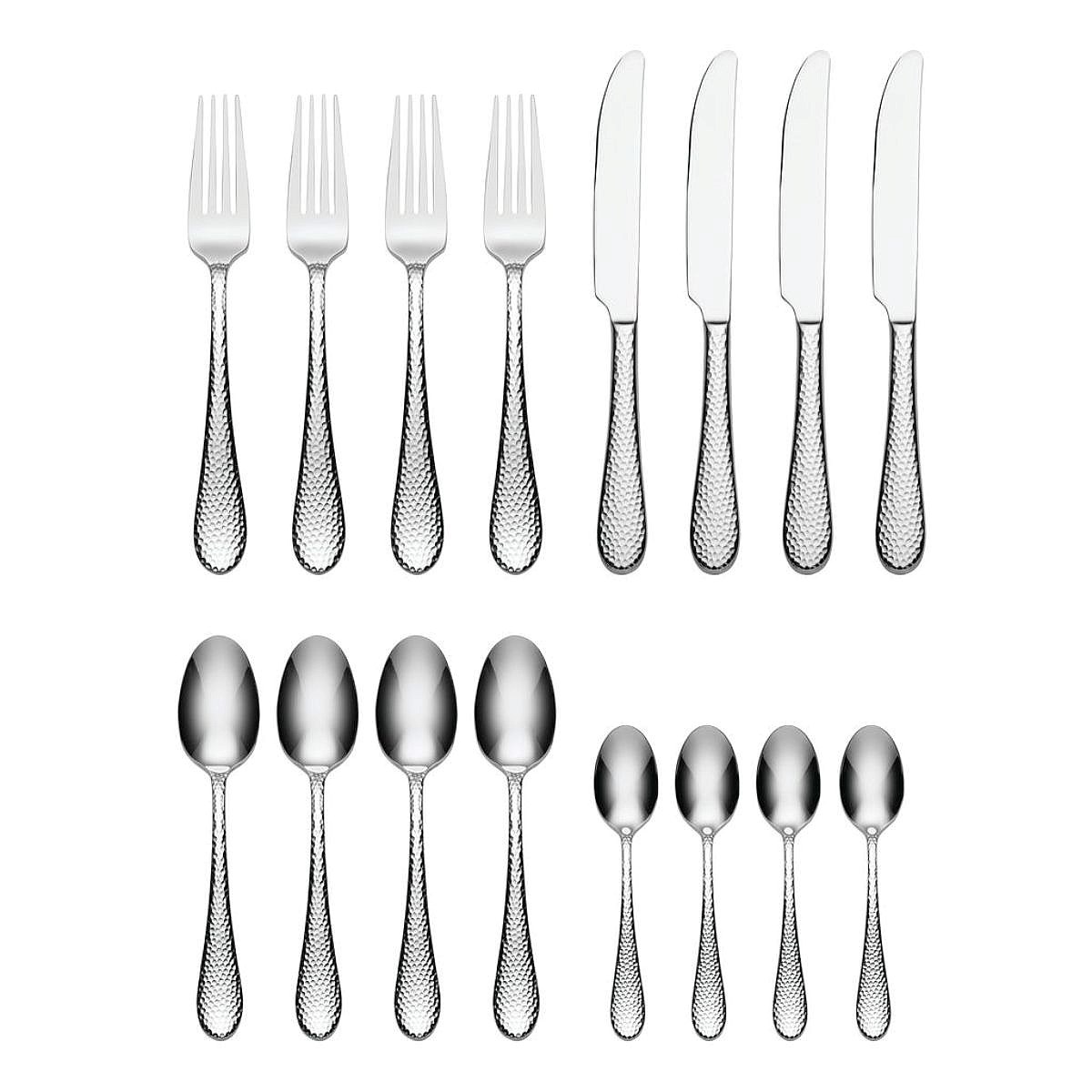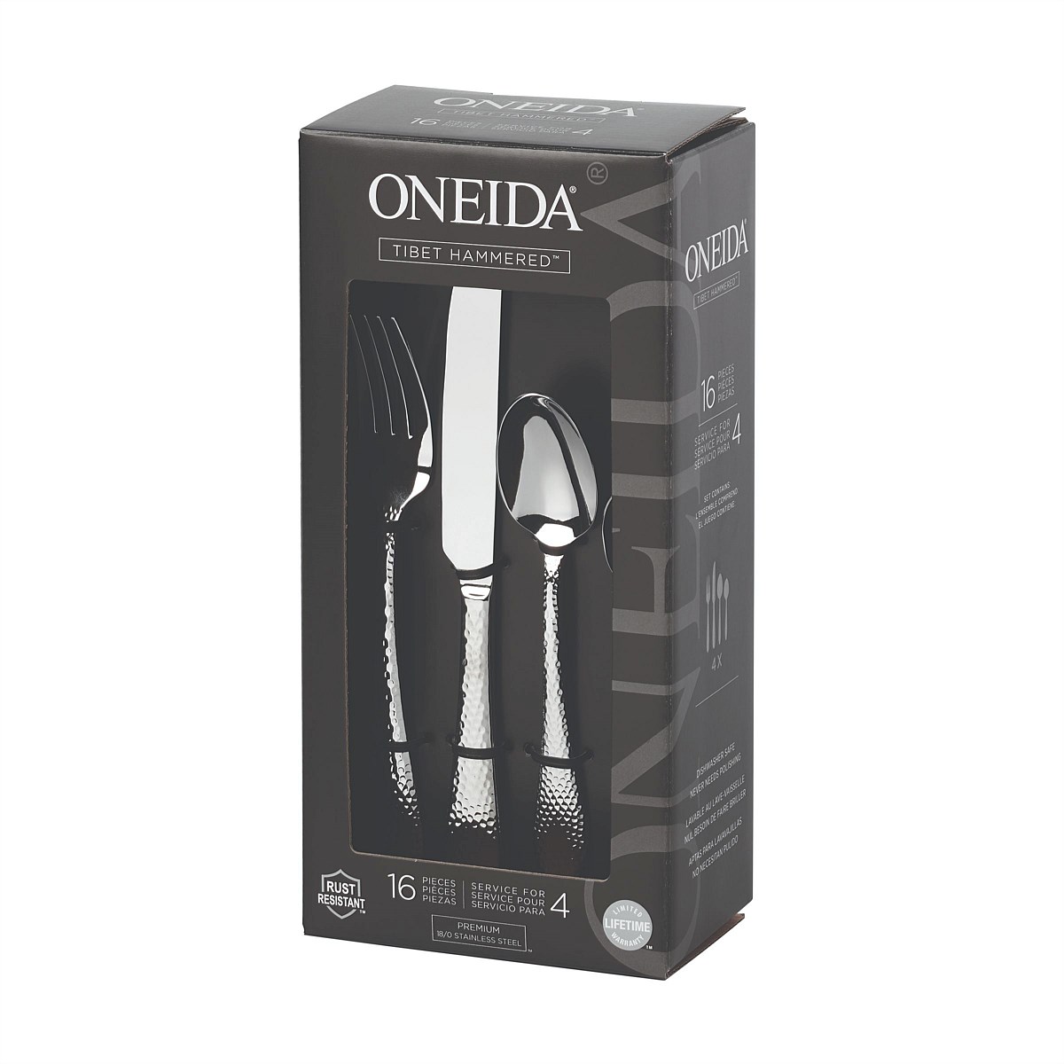 Oneida's Tibet Hammered 16pc Cutlery Set has an artistic hammered finish. Dine in rustic style with this charming cutlery patterned set by Oneida. The hammered finish gives stylish flair. Crafted from durable 18/0 stainless steel . Gift box packaging. Dishwasher safe, handwash recommended. 16 piece set includes 4 x dinner knife, 4 x table fork, 4 x dessertspoon, 4 x euro size teaspoon.