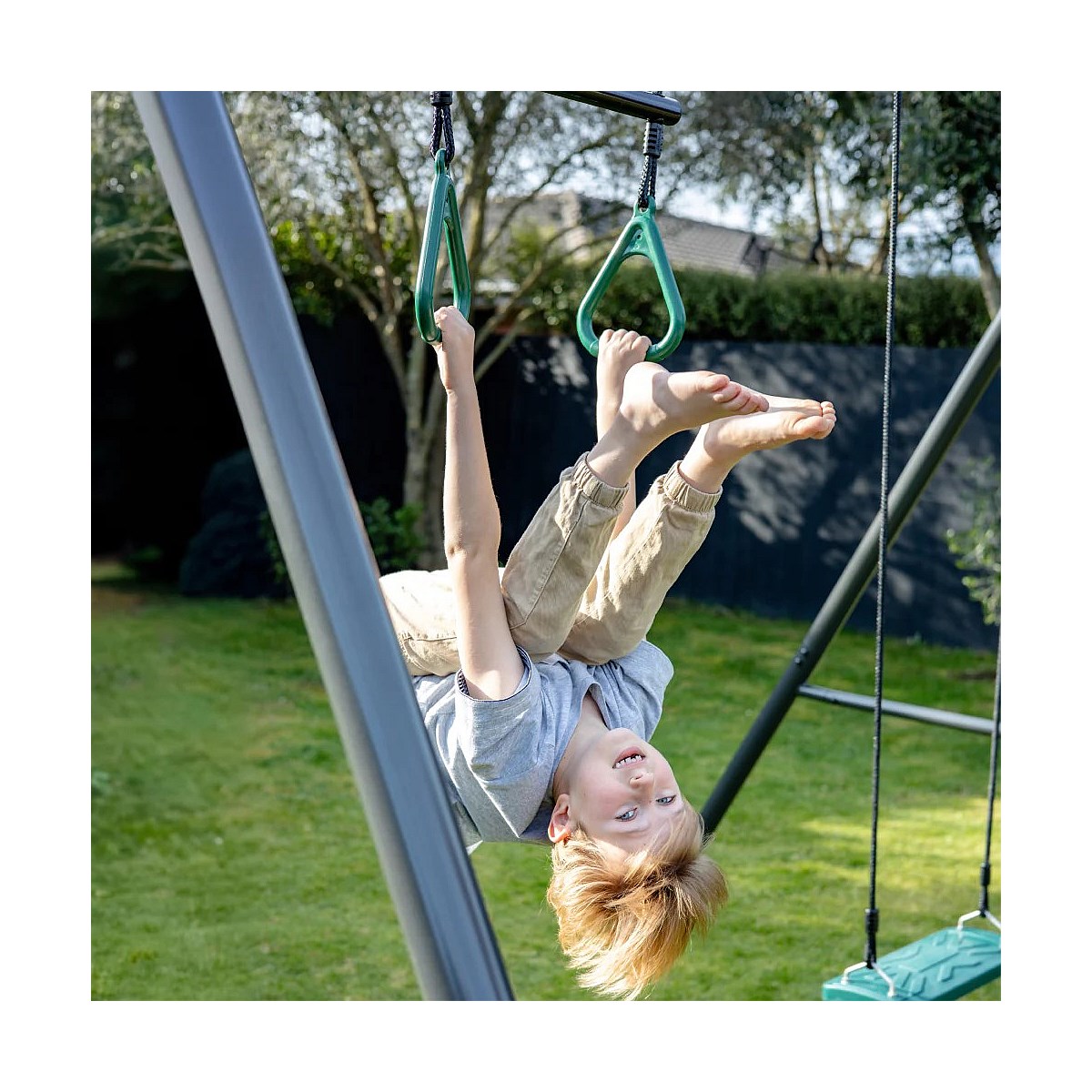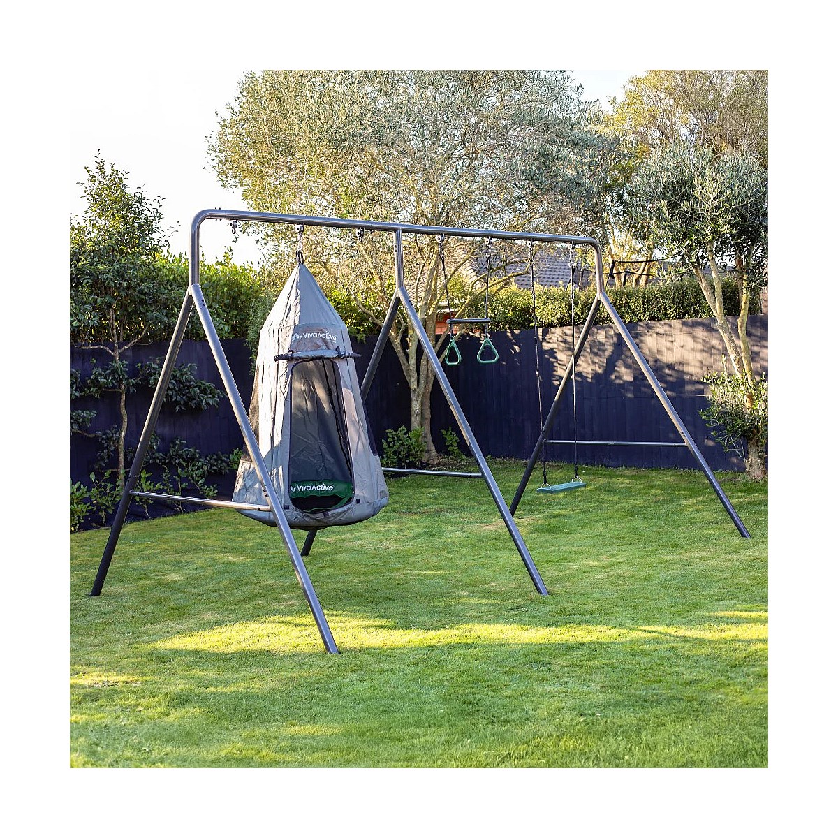 Spanning 3.9m in length and 2.5m (12.7 x 8.4 ft) in depth, this modular Swing Set provides plenty of space for your grandest adventures. The star of the show is the Saucer Tent Swing, a pleasant and peaceful place for kids to rest, read or relax. It also comes with a swing and trapeze bar -- a flexible find for large families or friend groups.
