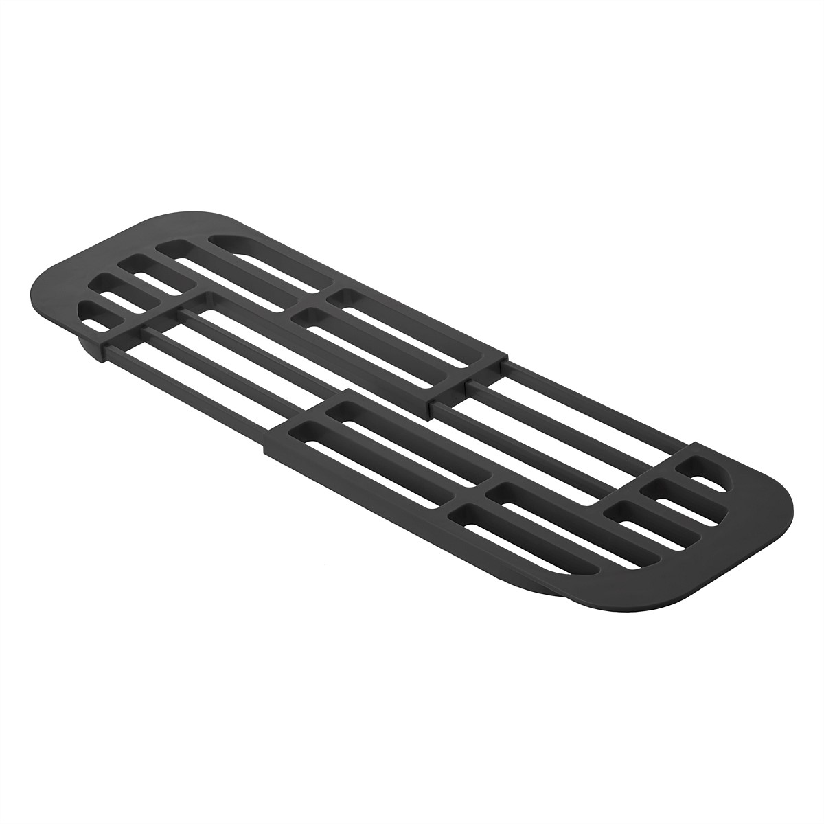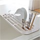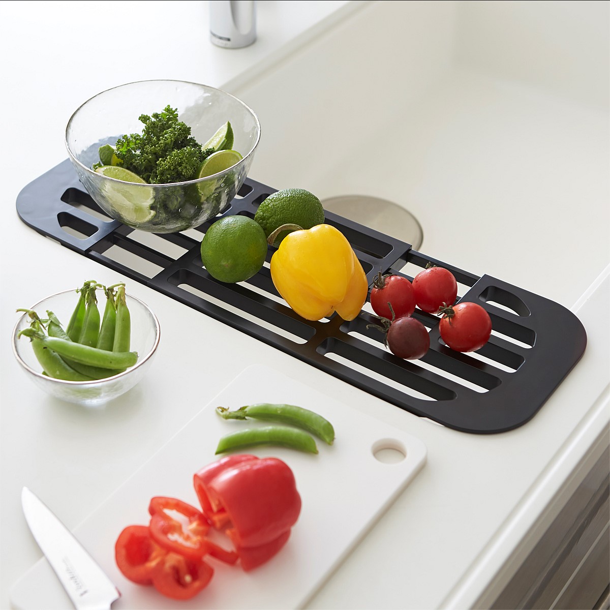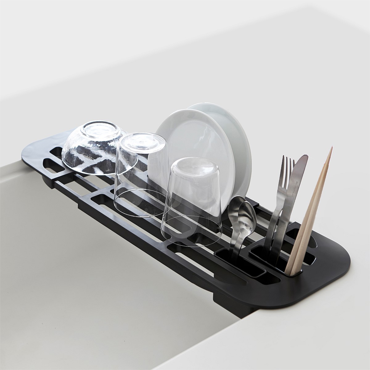 This sink drainer by Yamazaki is made from heavy-duty plastic and expands or contracts to fit numerous sink sizes. It sits over the sink to allow dishes to naturally drip dry. It comes with two small, removable, compartments for utensils. It can also be used to drain fruit & vegetables after rinsing.