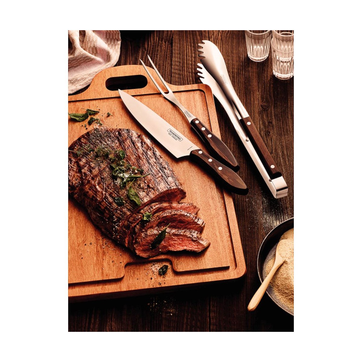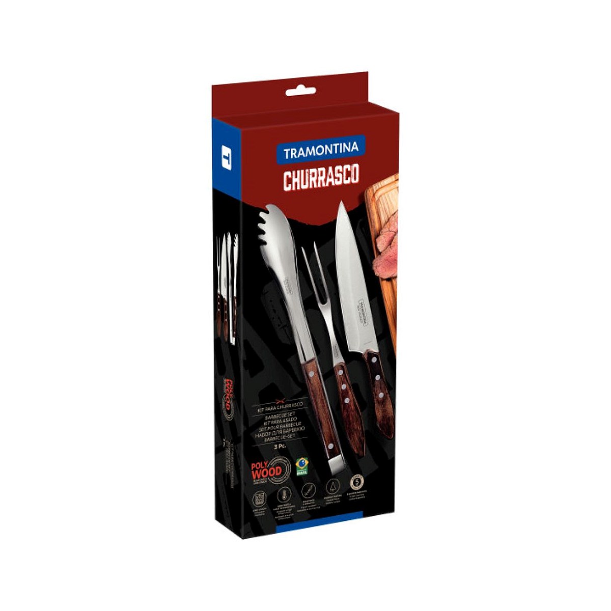 Tramontina's Churrasco line offers a complete solution for you to prepare and serve a delicious barbecue. Tramontina's 3-piece utensil set with stainless-steel blades and treated brown Polywood handles offers excellent cutting performance and more convenience for serving. The pieces are made of highly durable steel with treated Polywood handles which offer resistance to shock and high temperatures. A choice that will do beautifully well on every occasion.