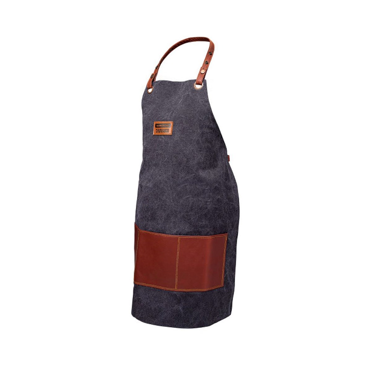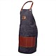 - Apron in semi-permeable denim fabric with a synthetic leather pocket. Lightweight and practical apron with front pocket.