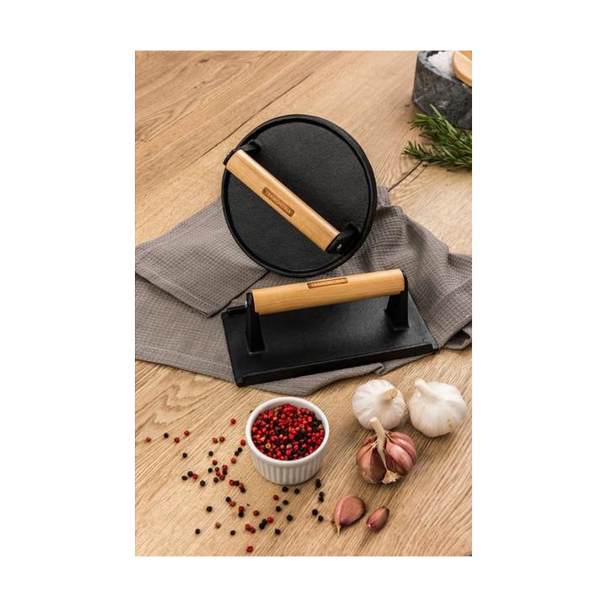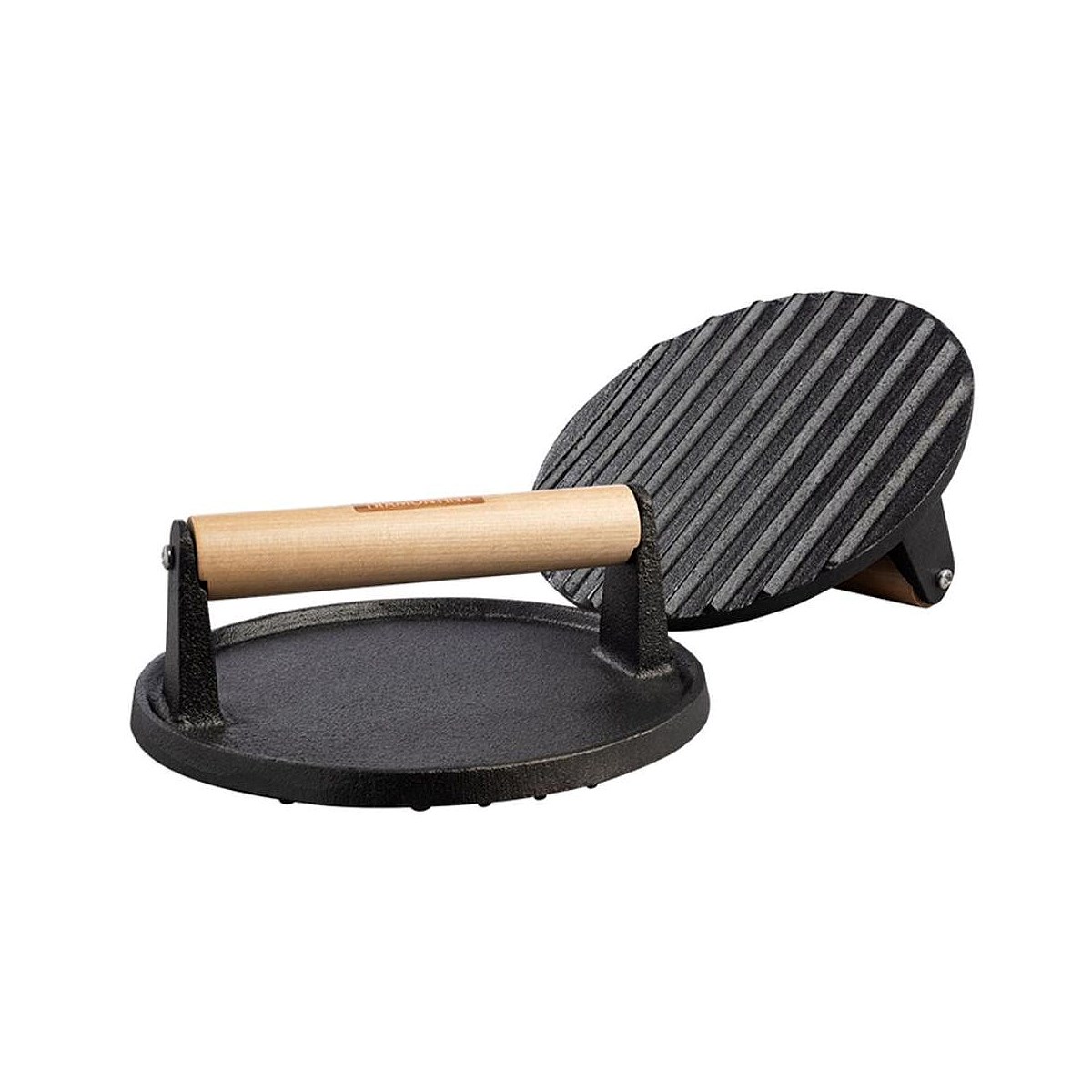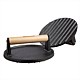 Complementing the cookware collection, this round grill press features a comfortable wooden handle and is the perfect tool for searing, pressing, speeding up and evening-out the cooking of burgers, patties, meat, poultry, and many other foods. Ridges create score marks to the food, adding to the authentic grilled look.
