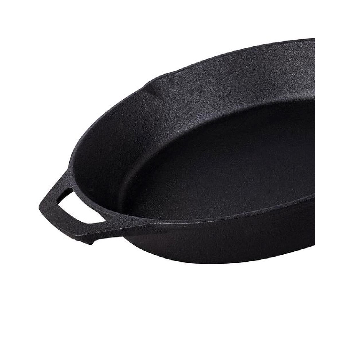 This skillet pan measures L46.4cm x W30cm x H5.8cm, has a 3.1l capacity, features an ergonomic handle with a hanging hole, a helper handle and two pouring lips. Although ideal for numerous cooking applications, it is especially well-suited for frying, sautéing, braising, searing, baking, grilling, and broiling.