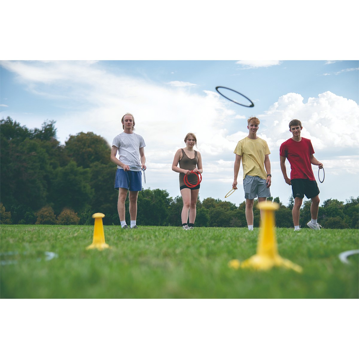 QUICK SETUP: Create a shooting line using the included line. Place the 3 Stars 10 feet apart, with 3 feet between each star in a triangle shape. Players toss rings into the triangle space, one at a time. Touch the star and watch the game change!