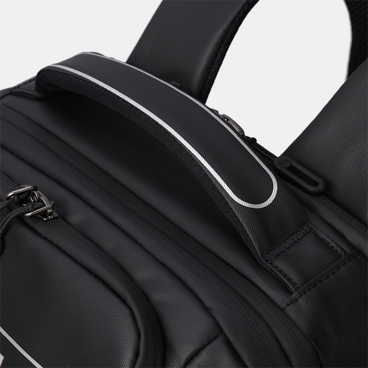 There’s also an RFID pocket and space for your phone in the main compartment. On the exterior, you’ll discover pockets for your bottles and a safety pocket on the back. There’s even a smart sleeve that slips over your suitcase handle when travelling and an integrated rain cover with reflective print. This cabin-sized bag includes compression straps on the outside that allow for a controlled opening and closure.
