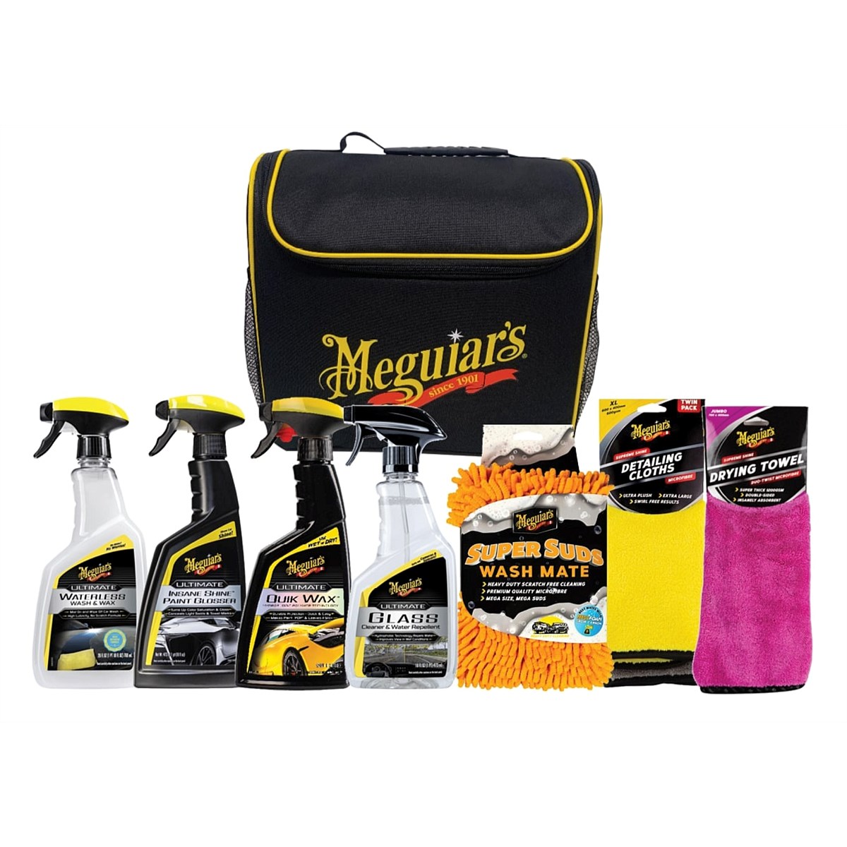 Clean, shine, and protect your car anytime, anywhere — no hose or bucket needed! Featuring Meguiar’s Ultimate Waterless Wash & Wax, this kit safely lifts dirt and grime while leaving a durable, glossy wax barrier that lasts for weeks. Boost your paint’s shine and conceal light swirls with Ultimate Insane Shine Paint Glosser, then finish with streak-free clarity using Ultimate Glass Cleaner & Water Repellent. Included are premium microfiber towels and the Super Suds Wash Mate mitt to make detailing quick and effortless on the move. Perfect for urban dwellers, apartment owners, or anyone who loves a spotless ride on the fly