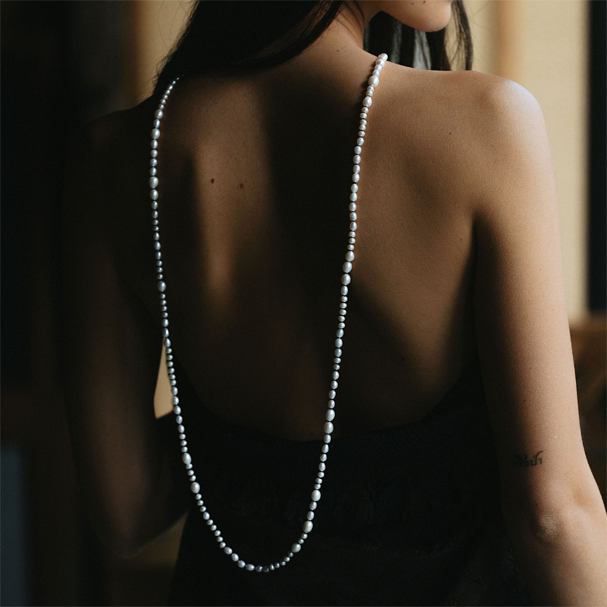 Created in response to artwork 'Siren' — a collaboration between Jasmin Sparrow with friend & artist Jade Townsend, the Veil Necklace acts as a single thread from the artwork's dense veil. Irregular shaped pearls are threaded and knotted onto a contrasting black silk, providing a dramatic material language. This effect is further explored in the necklace's length, measuring at 1.2 metres long it can be worn doubled around the neck, crossed over the body as a sash from the sea, or crafted into a belt to provide luster and accent to layered fabric.