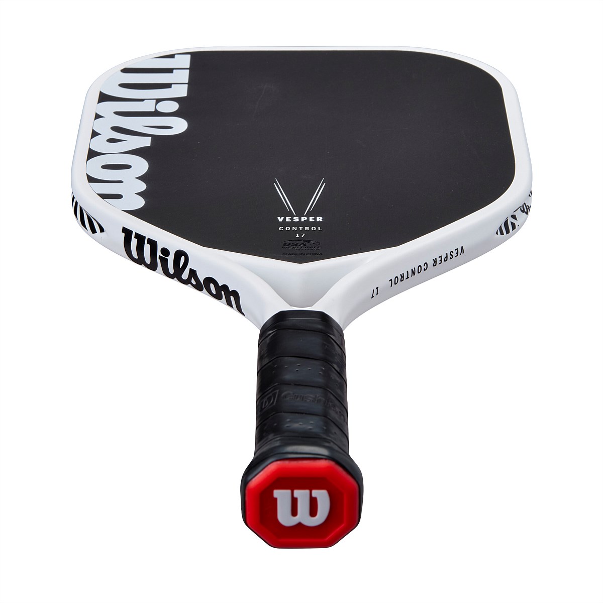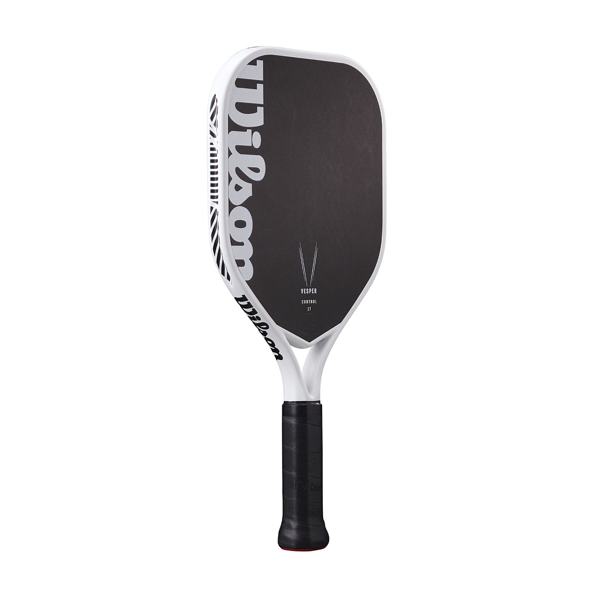 Wilson's Vesper Control 17 Pickleball Paddle elevates control and precision for competitive players. The first-of-its-kind bladder-molded frame and open-throat design optimize compaction while introducing bending into the mix, resulting in performance-enhancing power, speed and maneuverability. The wide shape gives maximum control by expanding the sweet spot, and a hybrid handle length is crafted for maneuverability and two-handed backhands. The raw carbon face with a high-density foam core maximizes the sweet spot and gives you plenty of spin.