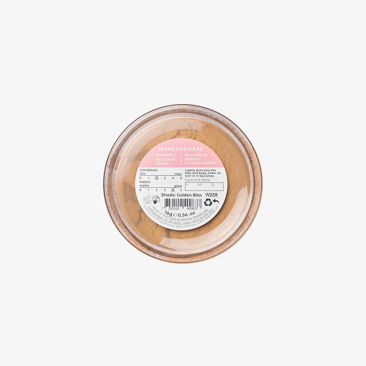 What you can expect: Vitamin C All Over Glow Powder is an ultra-fine powder with lustre and glow. The formula settles like a sheer veil over the skin and diminishes small fine lines and pores. The finish is a subtle shimmer without glitter.