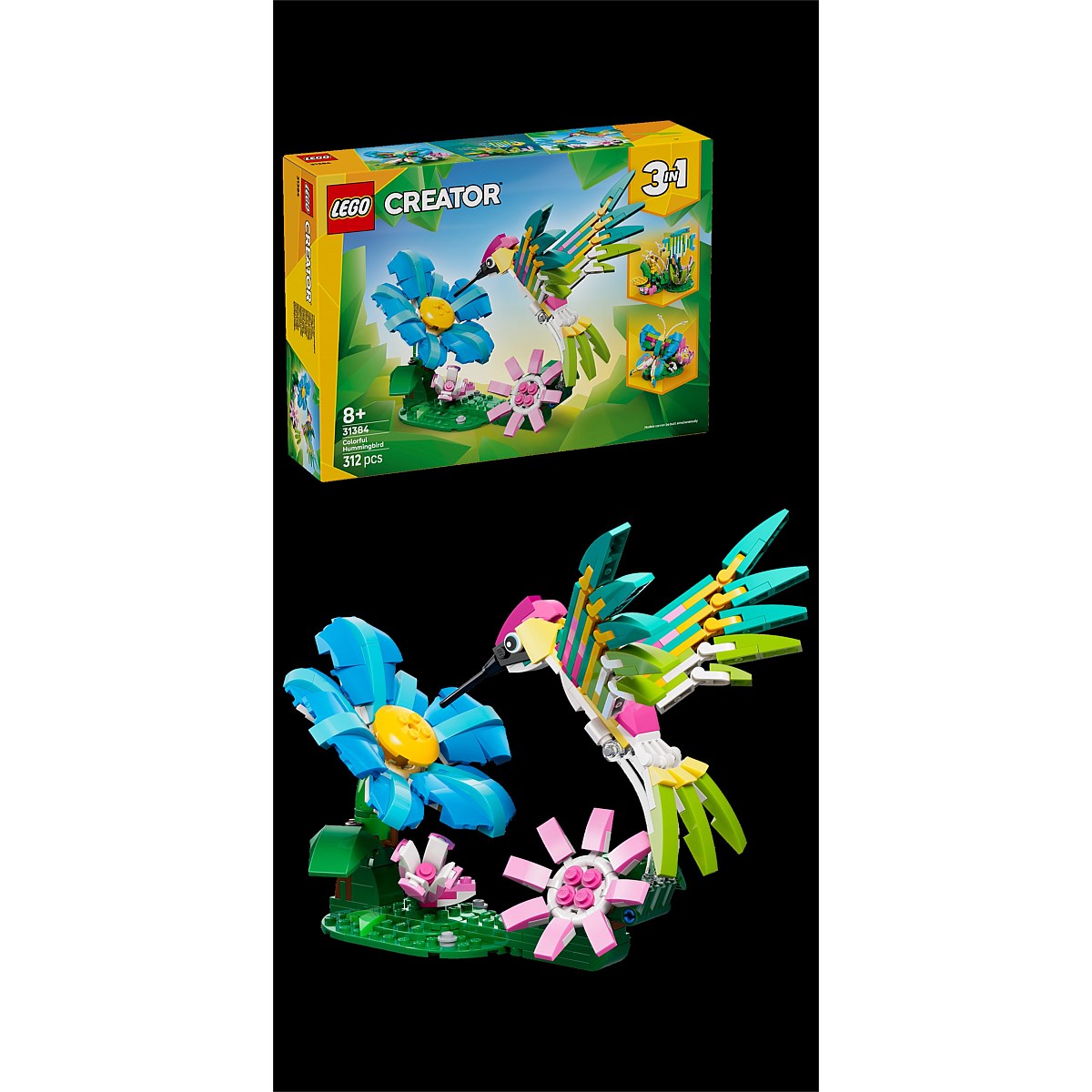 Animal-loving kids can play out charming stories with this LEGO® Creator 3 in 1 Wild Animals: Colourful Hummingbird building toy. This impressive animal figures set offers kids 3 different building options with the same set of bricks. They can choose to build a posable hummingbird in a dynamic flying pose on a stand with beautiful flowers. They can then rebuild it into a butterfly on a stand with flowers, or a tropical fish on a stand with underwater plants. Once the building and playtime fun is over, each animal toy can be proudly displayed as a beautiful piece of nature decor. This LEGO Creator 3 in 1 set will inspire young imaginations and makes a great gift idea for kids who love nature and gorgeous animals. Please note models cannot be built simultaneously. Set contains 312 pieces.